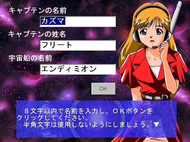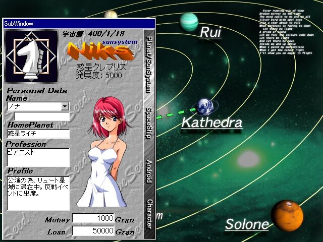 Distant future, another galaxy. There are five star systems each forming a nation. You are a freelance captain of a spaceship and can take missions varying from good transportation to pirates elimination and sometimes even revealing nation scale conspiracies. The whole universe is before you! vndbr...