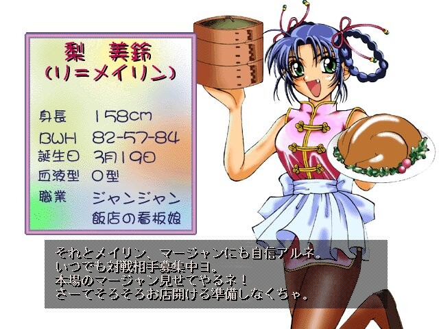 Strip mahjong with erotic scenes depend on main character choice : normal man, perverted SM man and lesbian foreigner girl. vndbreview]