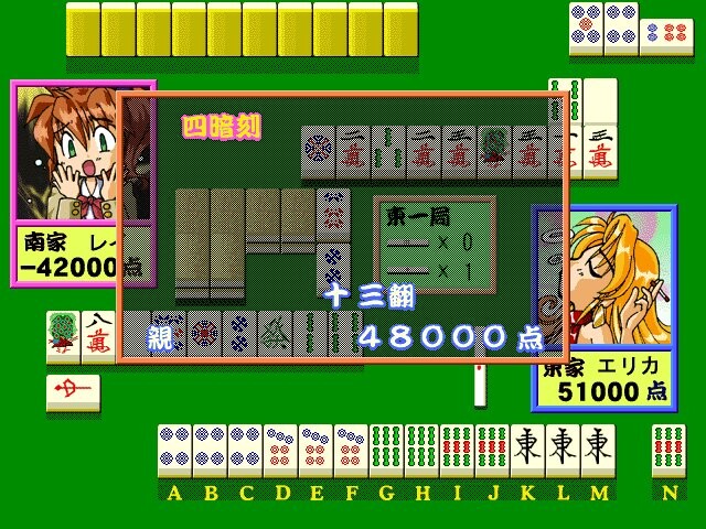 Strip mahjong with erotic scenes depend on main character choice : normal man, perverted SM man and lesbian foreigner girl.