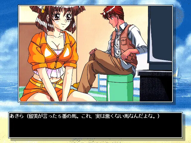 This game is an animation omnibus ADV that uses the new animation system "Moni Moni System" exclusively for Windows 95. It contains two short stories: "Private Tutor" and "Horse Racing The Lover", both are made using full animations.