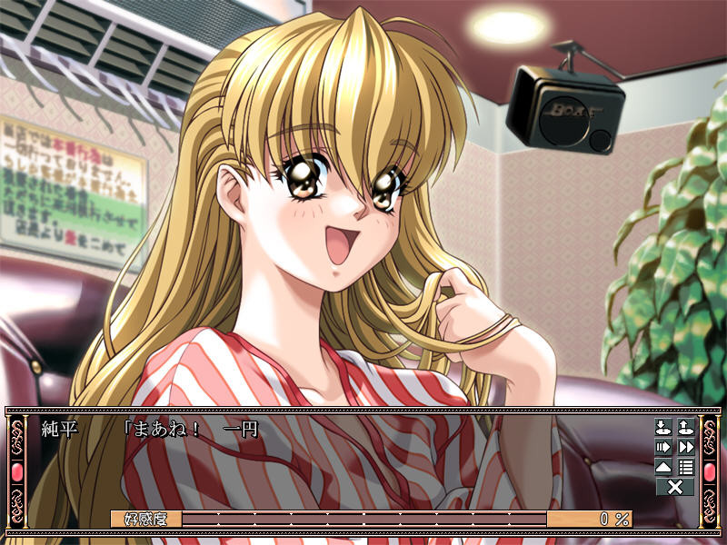 The protagonist is an average guy. One day in the street I meet up a agent who introduces me into a H shop (Image Club). I'm unwilling because it may be coarse, but he confidently says to me that there's a pretty girl in the shop, so I change my mind and get in. Yes! A beautiful and nice girl named Candy welcomes me. From now on the story's simple. We talk familiarly for a while and take a H situation-play. From time to time I meet up a girl in the street who resembles Candy in appearance but she says she doesn't know me. Who is she?