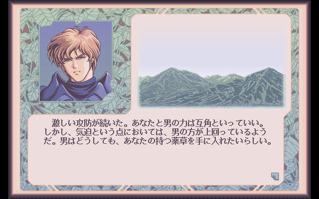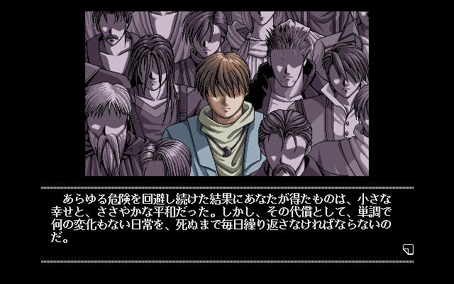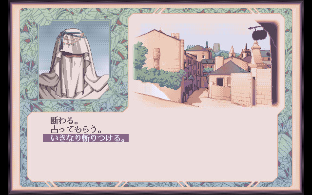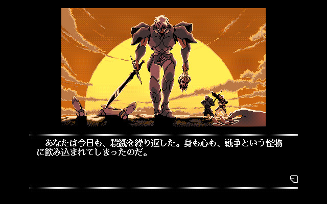 Hero is a warrior who enters a normal fantasy setting town and ... player choices determine the rest. vndbreview]