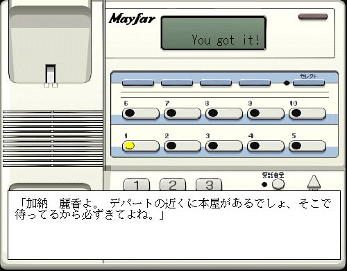 At a place where girls phone in, a guy waits. When a girl calls in, he talks with her. If he respond right, he will meet the girl and have fun. This game is a simpler version of Virtuacall 1.