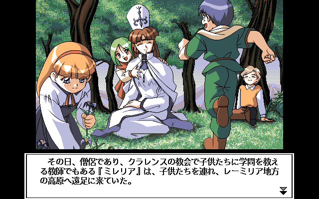 The kingdoms of Clarence and Garla are at war with each other. The priestess Mirelia leads a group of children refugees through a forest, and is attacked by Garlan troops. Guy, a Garlan officer, doubts the methods of his superior, general Neston, and helps Mirelia and the kids escape. On their way t...