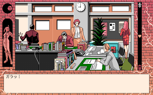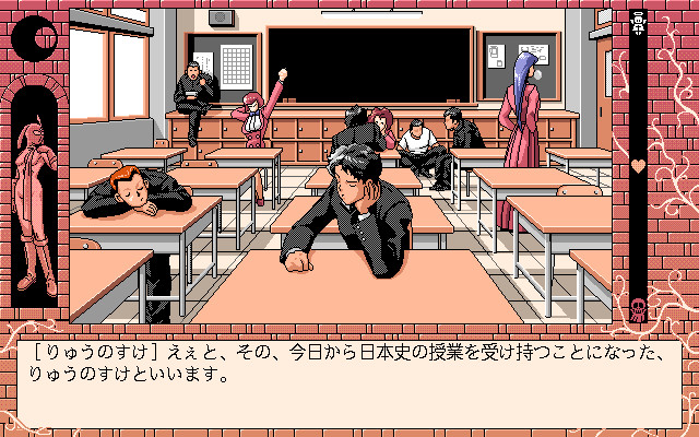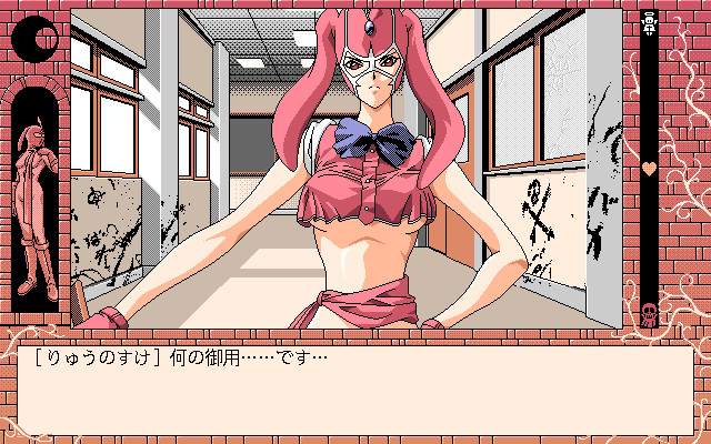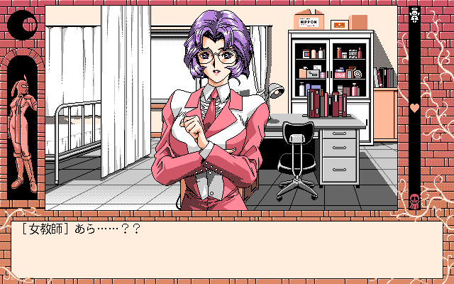 In the sequel to to the first Kekkō Kamen, the player is no longer required to control the satanic protagonist of the previous game. Instead, the protagonist is a young substitute teacher (default name Ryusuke) who is perplexed at his discoveries in the high school he is invited to work for. As the title implies (shioki means "corporal punishment"), some teachers and students engage in bizarre sadistic activities. It's up to the player to decide how the new guy will fit in.