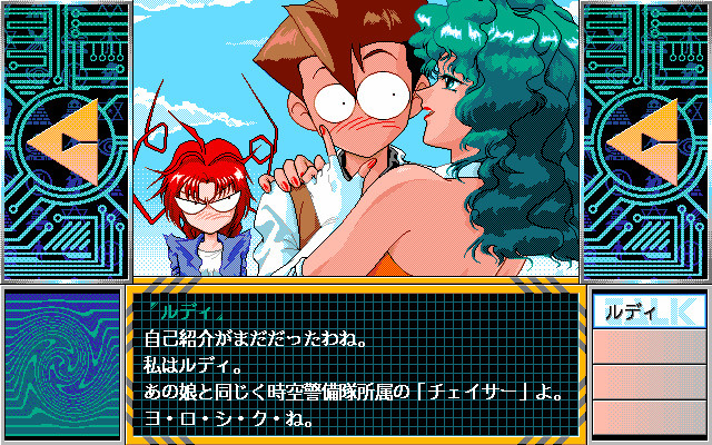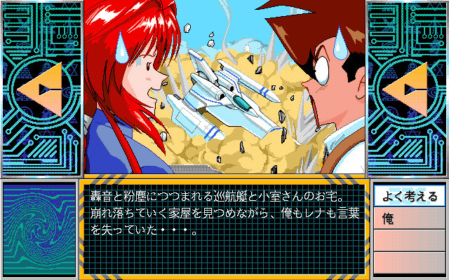 Daiskuke gets accustomed to living with Rena when his house gets demolished again by another space ship landing on it. Rudy comes out of the ship claiming that she's a friend of Rena. vndbreview]