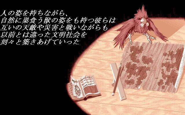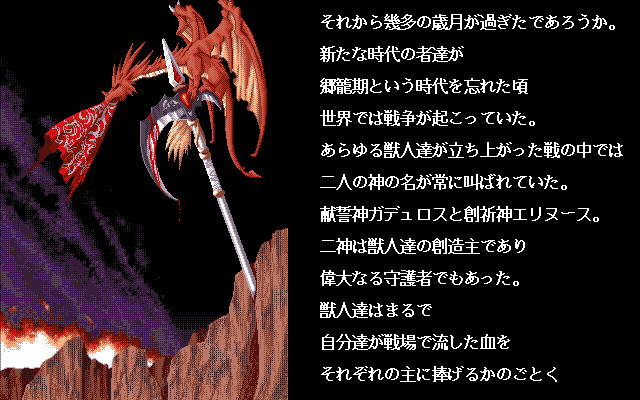 Last Guardian ~Juukyou no Shugosha~ is set in a fantasy world ruled by gods and inhabited by many different races. Many years ago, two of the gods fought each other, until the god Gaduros emerged victorious, imposing a harsh rule over the nation of the Winged Beasts until the beautiful goddess Typhon defeated Gaduros.