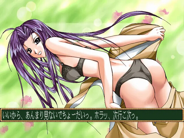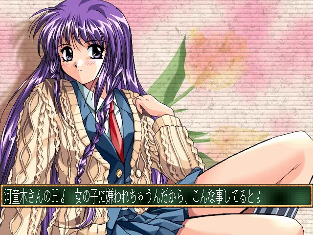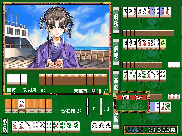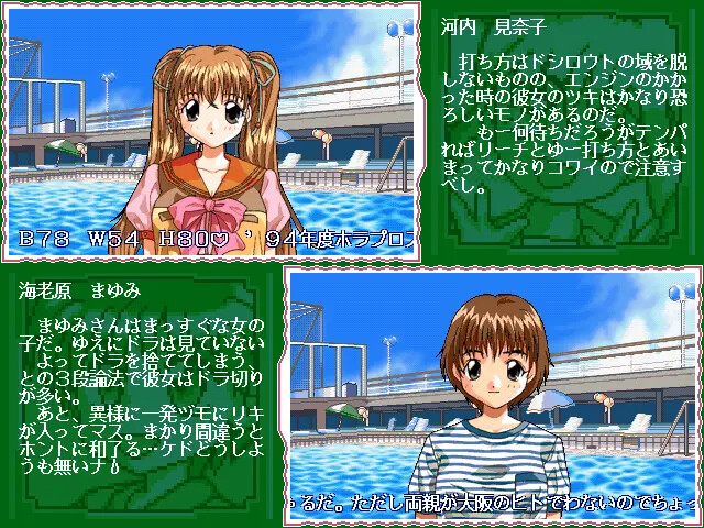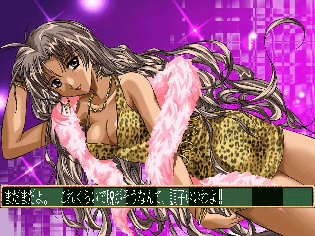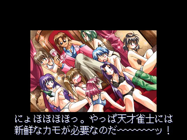You play a long-haired salaryman as he visits random clubs to play in 4-player mahjong against girls, who strip if they run out of funds. The games doesn't end until you either strip all of the girls or run out of funds yourself. sutorippu]