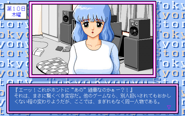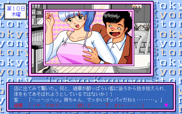 Hero works at the counter of a coffee house along with five beautiful women. He lives on the second floor of the same building since it belongs to his father. One day he discovers a TV set that is connected to hidden cameras around the coffee shop... vndbreview]