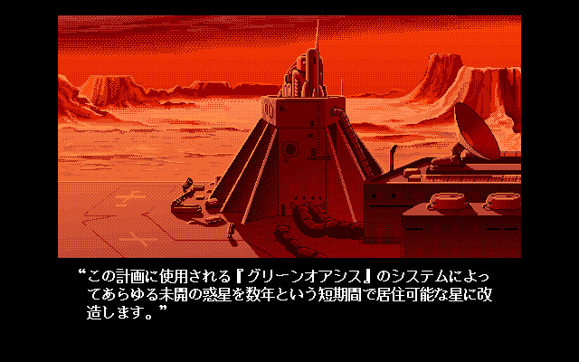 Green Oasis is a system of rebuilding any undeveloped planet into an environment suitable for life over the course of several years. A development officer responsible for Oasis Plan on a certain star was attacked and injured with important documents stolen.