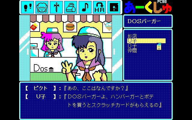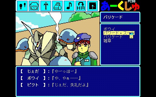 Arcshu: Kagerou no Jidai o Koete is loosely related to the greater Arcus series. It is a visual novel created in the parody style, and in the process hits many common pop culture items of the day (movies, novels, comics, animation, etc.). The story follows the main character, Jeda, through a series of still images and standard adventure-game puzzles and menu-based navigation as the player works through an overlying mystery. As the story progresses, Jeda finds that there is a hole in his dimension, and the only way to repair this hole is to travel through other dimensions (and time) to seek out a mystical holy sword and a group of CDs that will restore things to their proper nature. Throughout this journey, there are numerous cameos and other appearances by other Wolf Team and Nippon Telenet characters from various other media (The Valis Series, Midgarts, Final Zone, etc.). Musically, there are also numerous tracks that have been pulled from these same properties (and in some cases comically rearranged) and are used to good effect here.