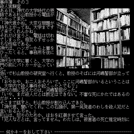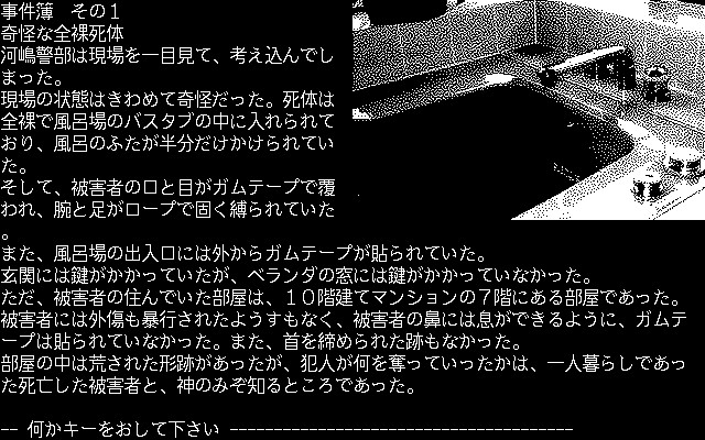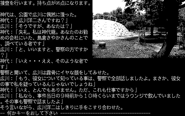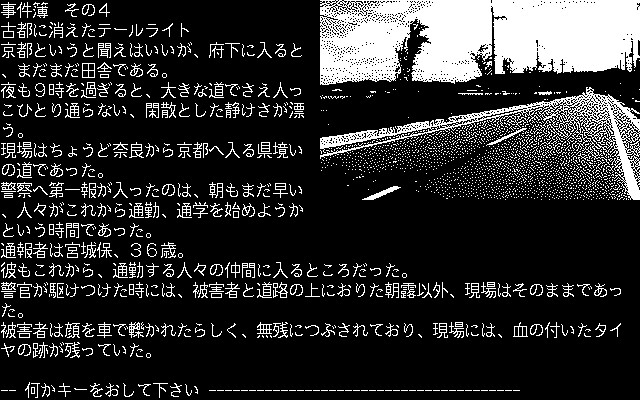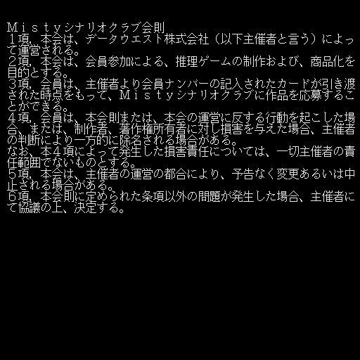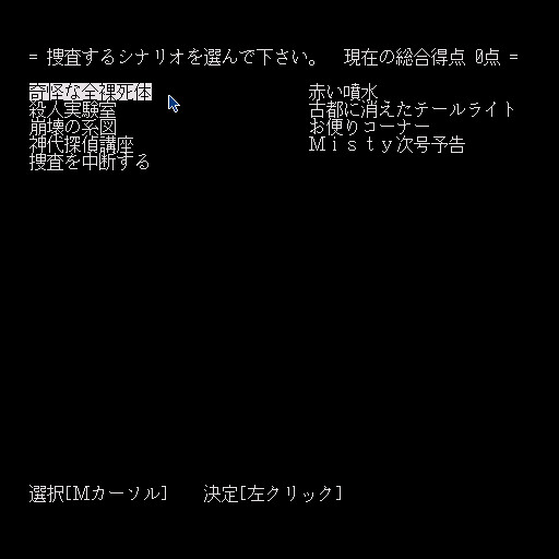 Misty Vol.1 is a detective mystery adventure game set in modern-day Japan and starring the young private investigator Ryū Kamishiro. The game consists of five unrelated cases that can be accessed in any order from the main menu. These cases range from seemingly mundane matters to thefts, mysterious disappearances and murder investigations.