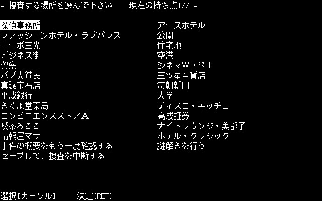 The game largely consists of text-only descriptions and dialogues, though some locations and scenes are accompanied by sparse black and white digitized photos. The player is presented with a text list of locations in the city, and much of the gameplay is dedicated to repeatedly visiting them, searching areas and questioning suspects.