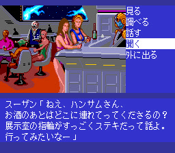 "Cobra" is a Japanese-style adventure. You select commands from a menu (such as "Look", "Talk", etc.), thus interacting with people and objects. In certain places you can also move your character, viewed from third person perspective. Being one of the first games to use CD ROM format, "Cobra" features animé-style cut scenes as well as voice-overs for some dialogues.