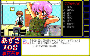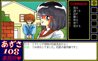 Main character Azusa is a female private detective. While on a major case of finding the missing relative she also takes a request to investigate consecutive rape cases that occurred at her girls' school dorm. vndbreview]