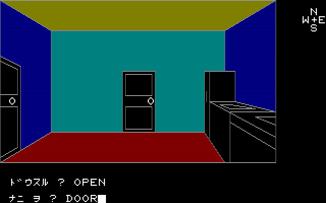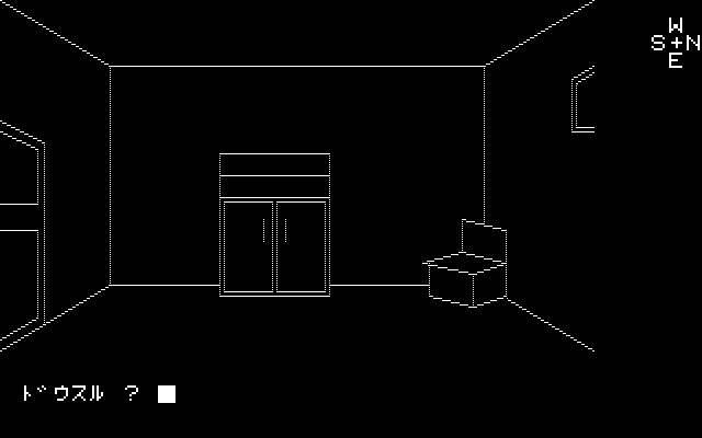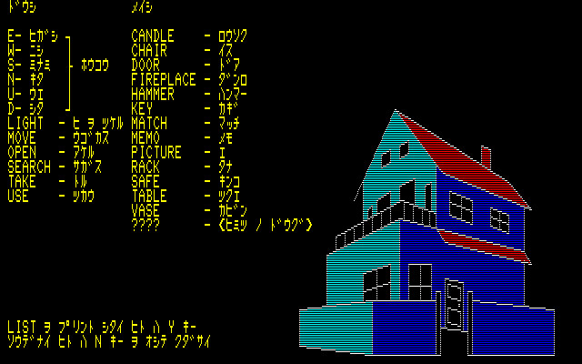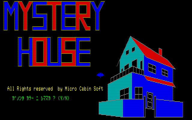 Mystery House is likely the very first Japanese full-scale text adventure game with pictures. The game is inspired by Hi-Res Adventure #1: Mystery House and although it uses the same name and gameplay, there is no Agatha Christie-esque subplot, no competitors and the player is alone. The objective of the game is to find a treasure that is hidden somewhere in the house and then escape with it. Several items can be found around the house that can be picked up and used in order to proceed. There are also various hazards that will kill the player's character if not careful enough.