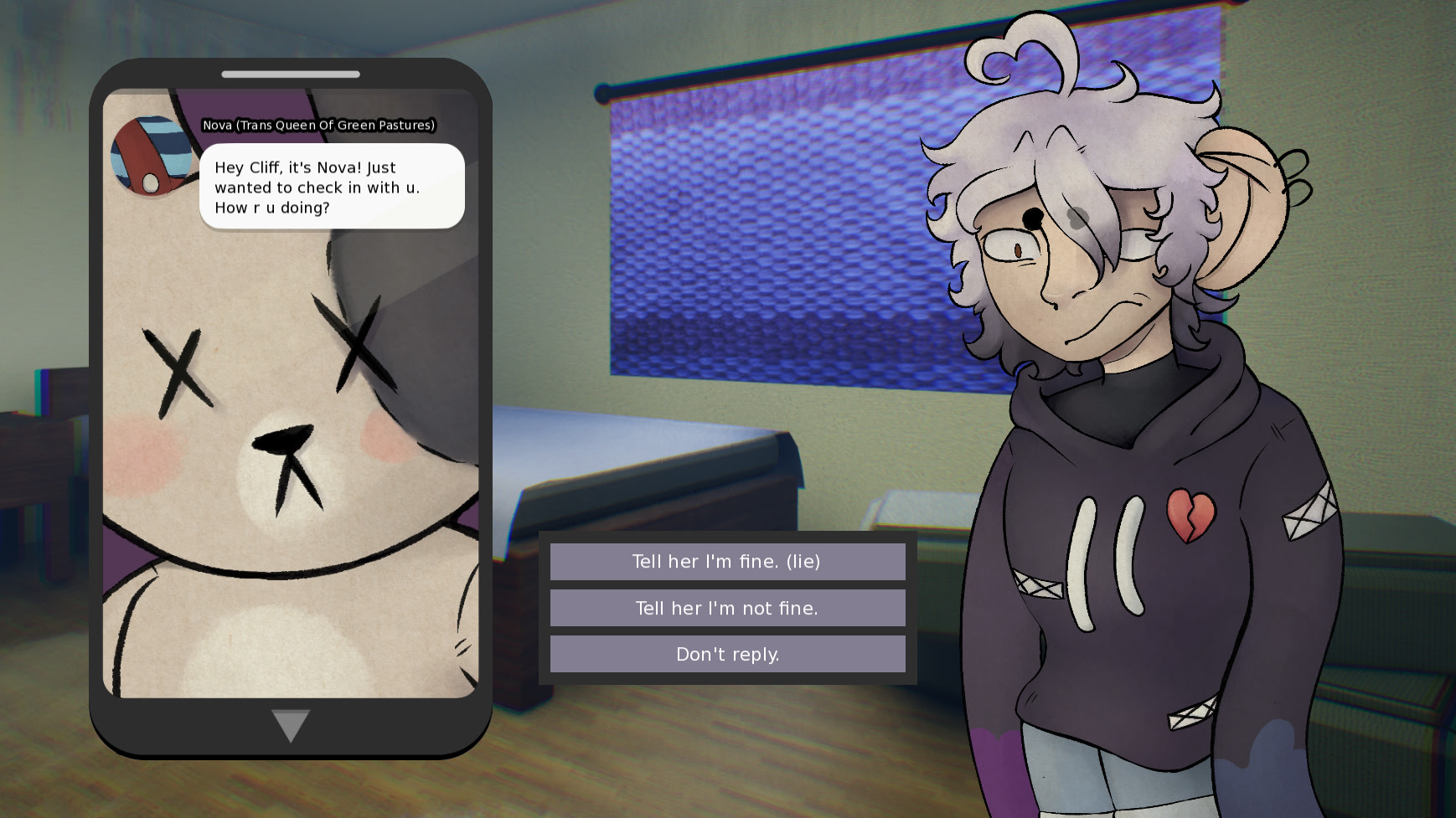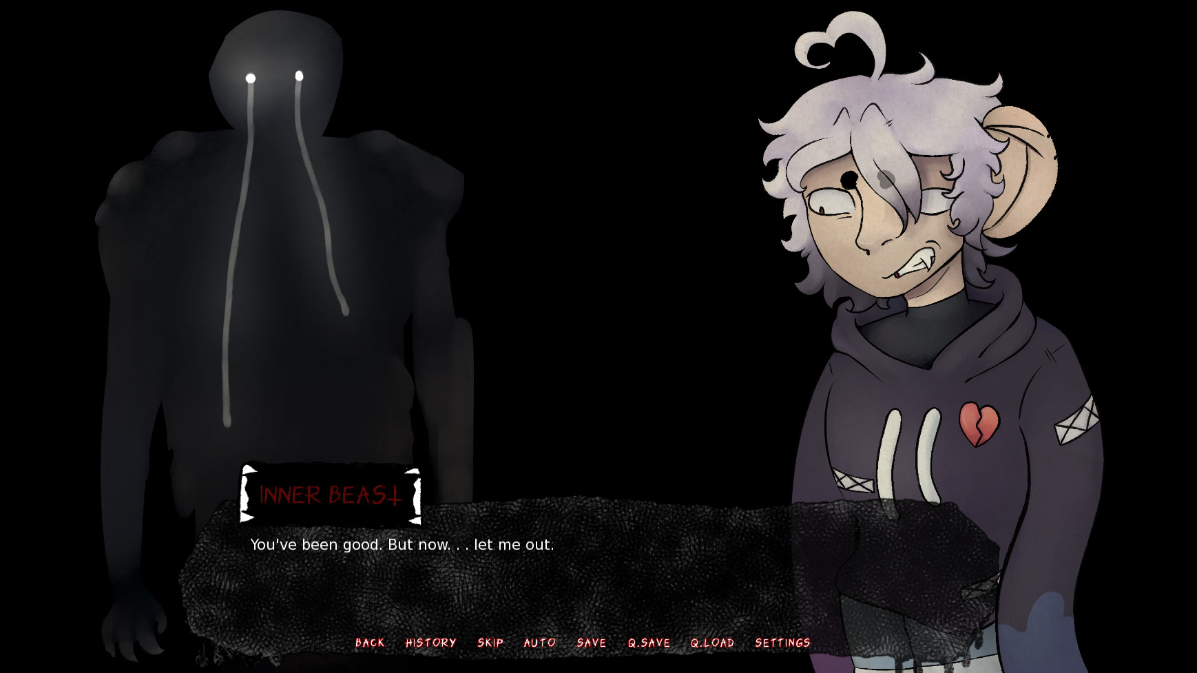 Cliff needs help before the monster gets out. It's been rising inside him ever since he was ████████ . When an old friend comes back into his life, will he be able to trust her, before the beast breaks free? itch.io]