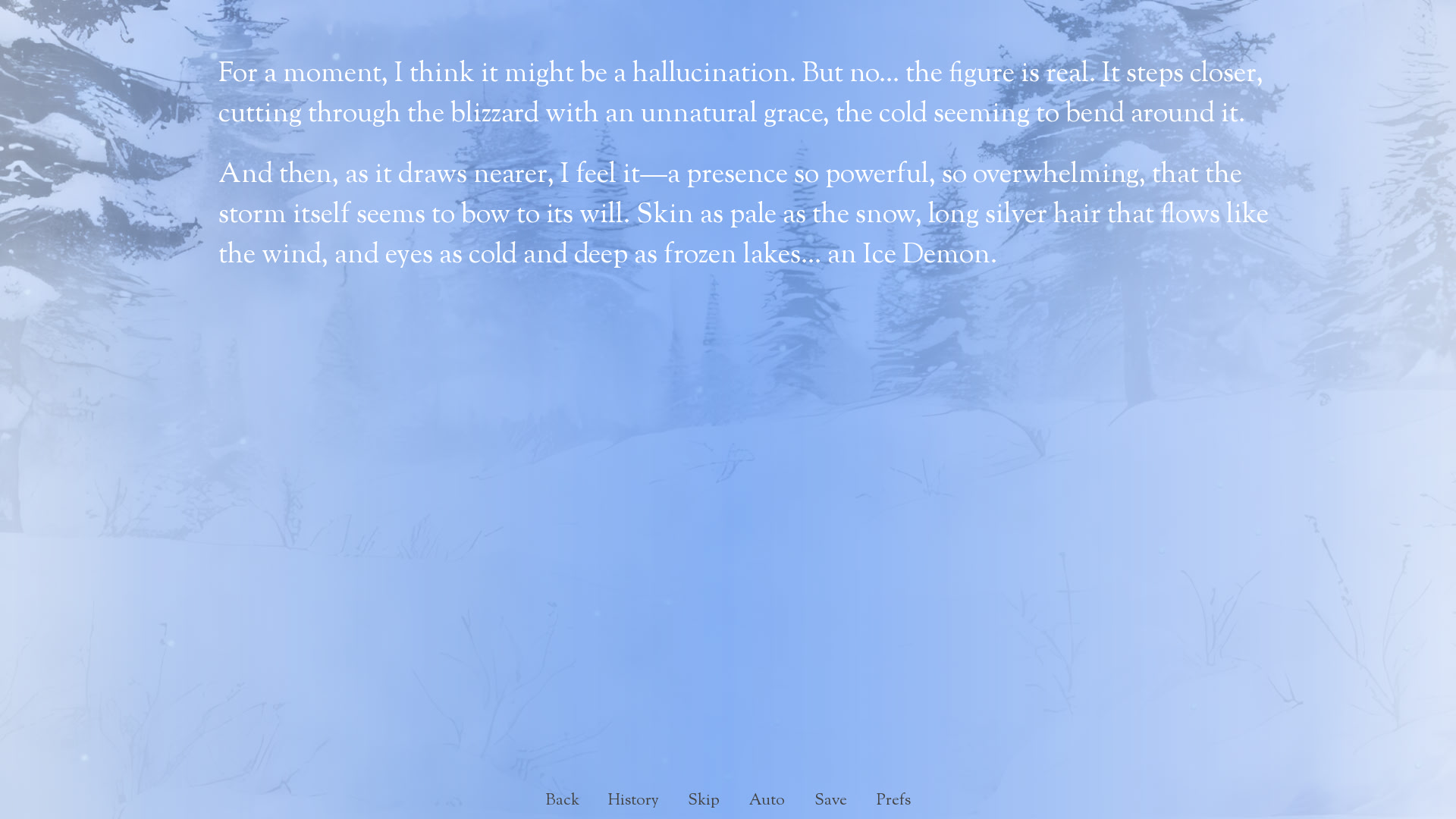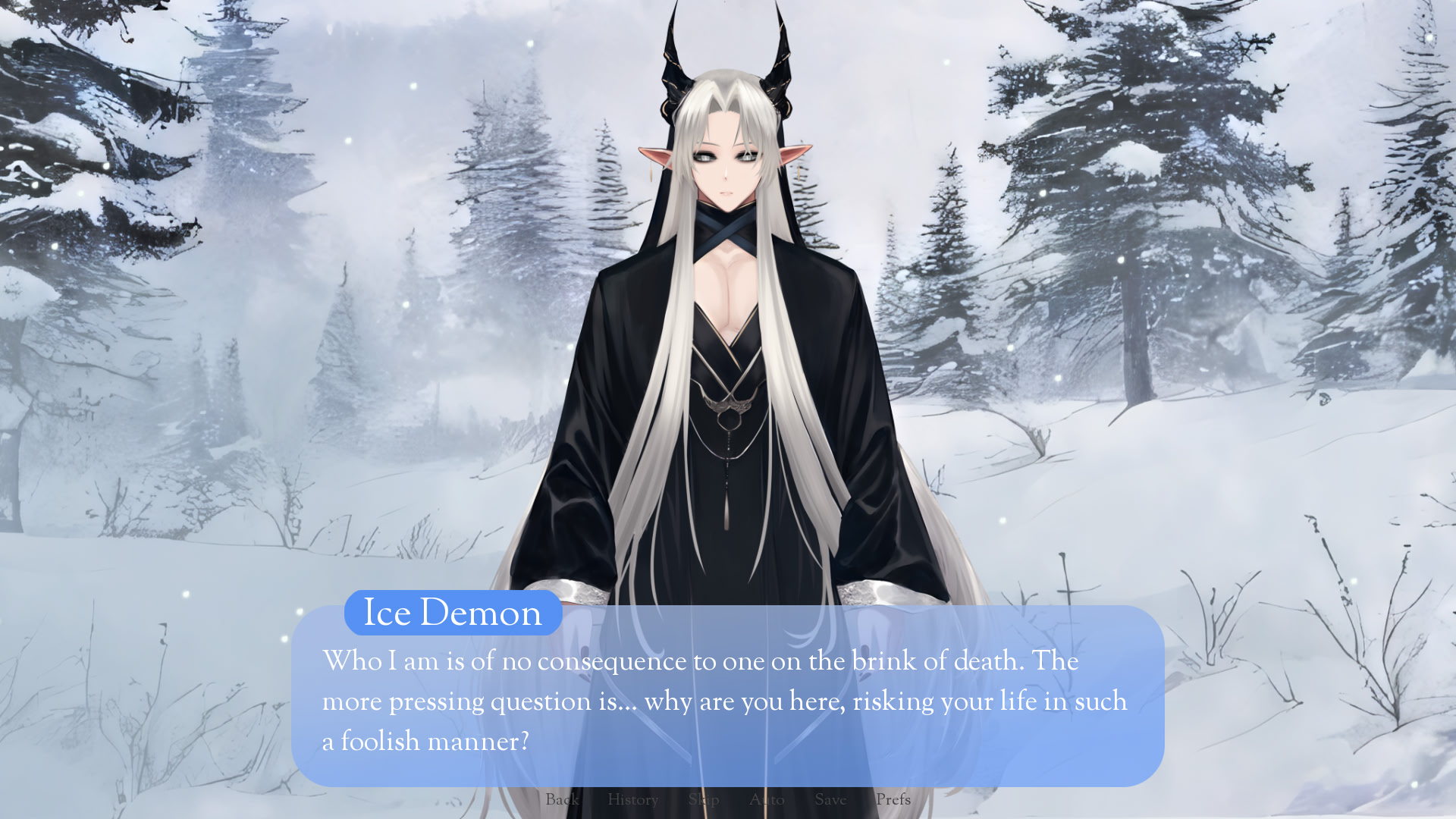 Shen Wei, a dedicated cultivator on a perilous mission to save his master, finds himself lost and near death in a treacherous snowstorm on a remote mountain. Rescued by a mysterious Ice Demon, Shen Wei is faced with an impossible choice. itch.io]