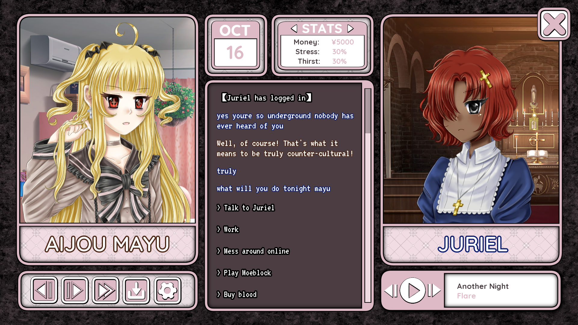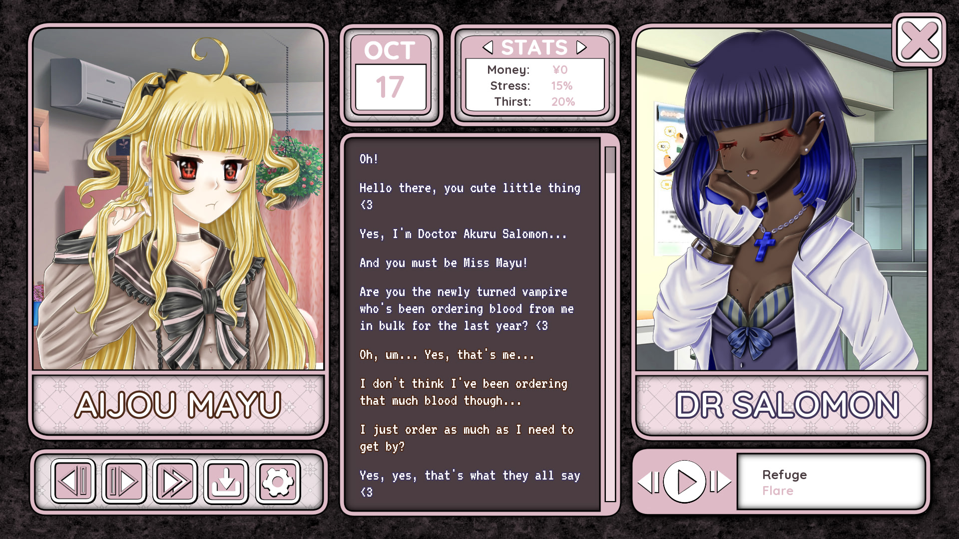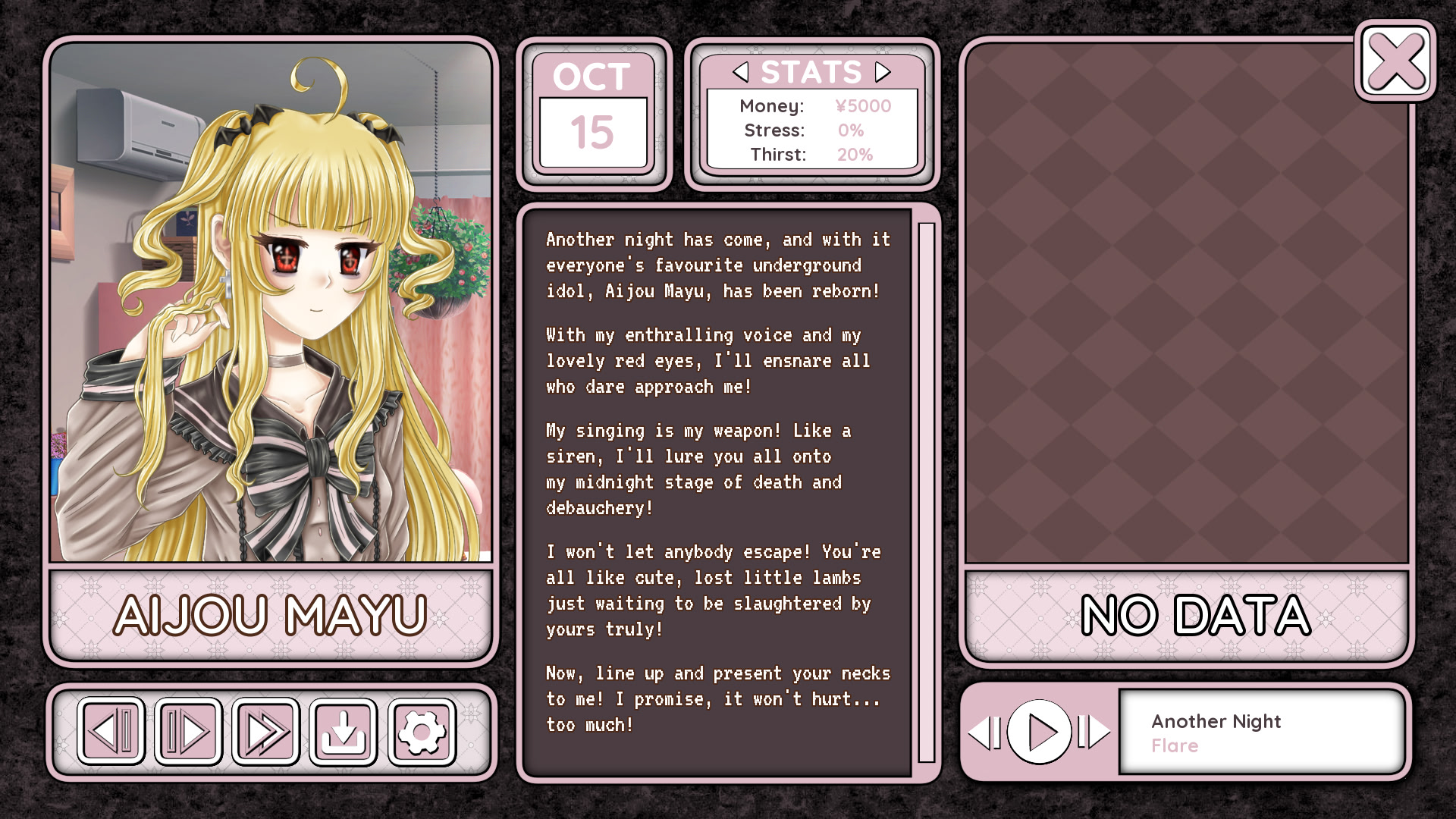 Assume control of Mayu and manage these tumultuous two weeks of her life. Help her raise money to avoid a grisly end, all while managing her stress levels and forming relationships with girls over the internet. You never know: come Halloween, Mayu might be able to land a date, and she might even get to nibble on a cute girl’s neck!
