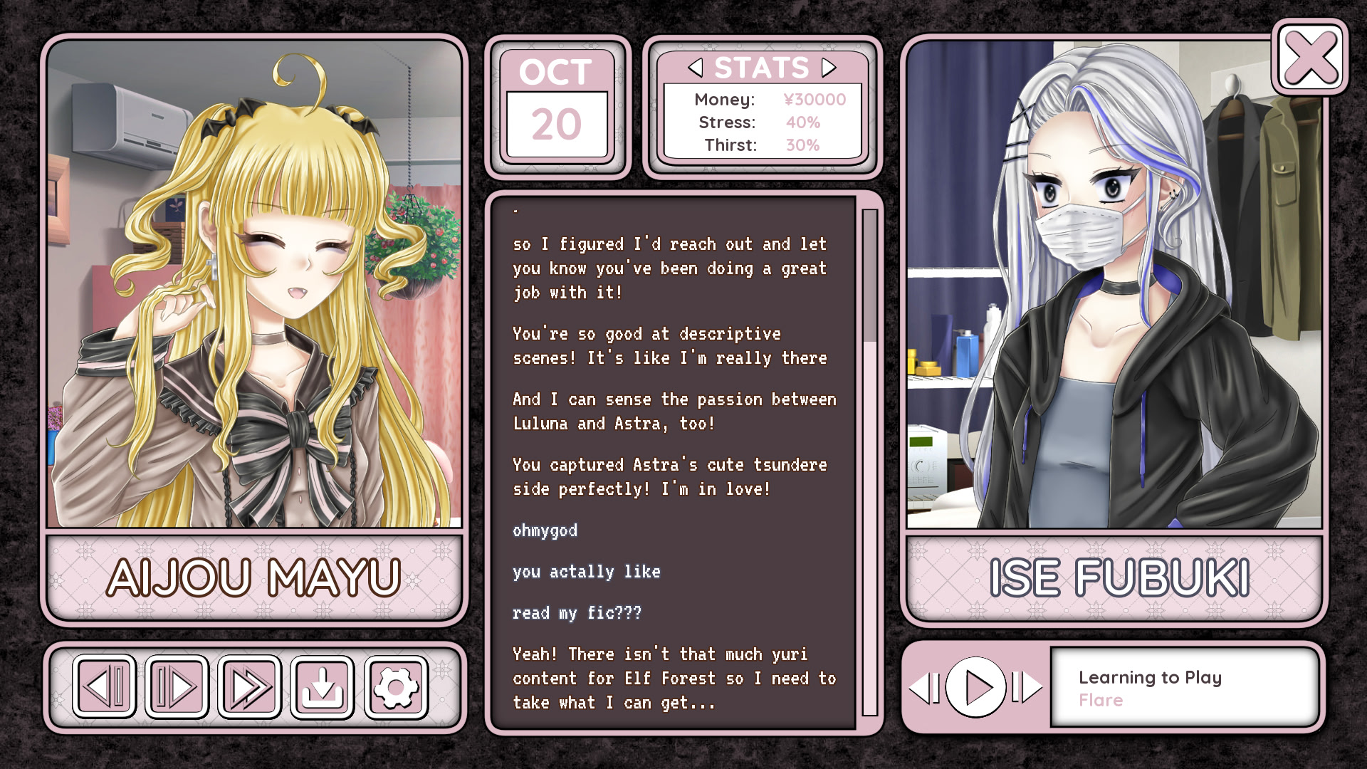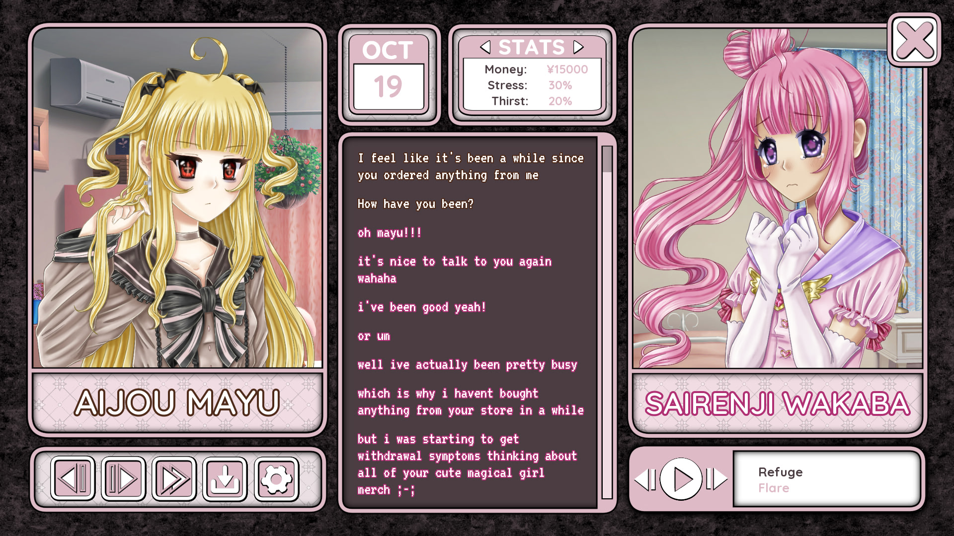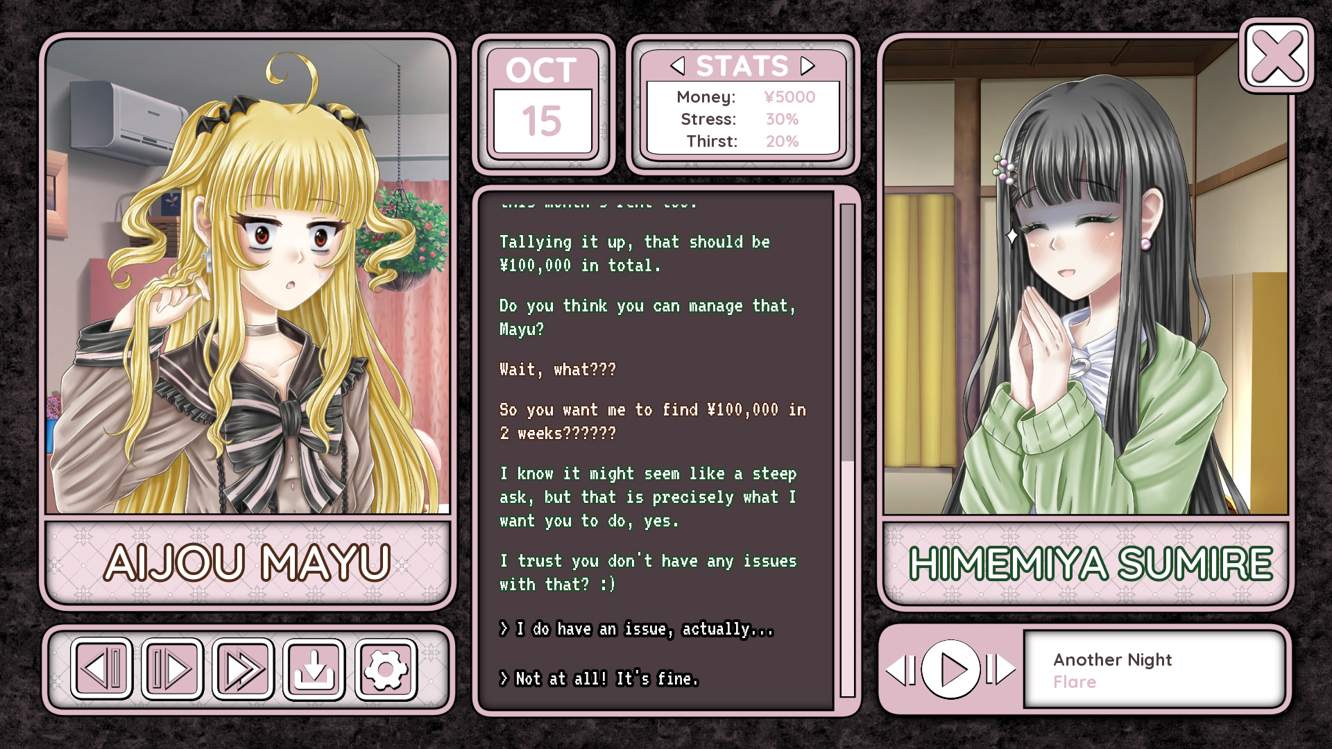 Assume control of Mayu and manage these tumultuous two weeks of her life. Help her raise money to avoid a grisly end, all while managing her stress levels and forming relationships with girls over the internet. You never know: come Halloween, Mayu might be able to land a date, and she might even get to nibble on a cute girl’s neck!
