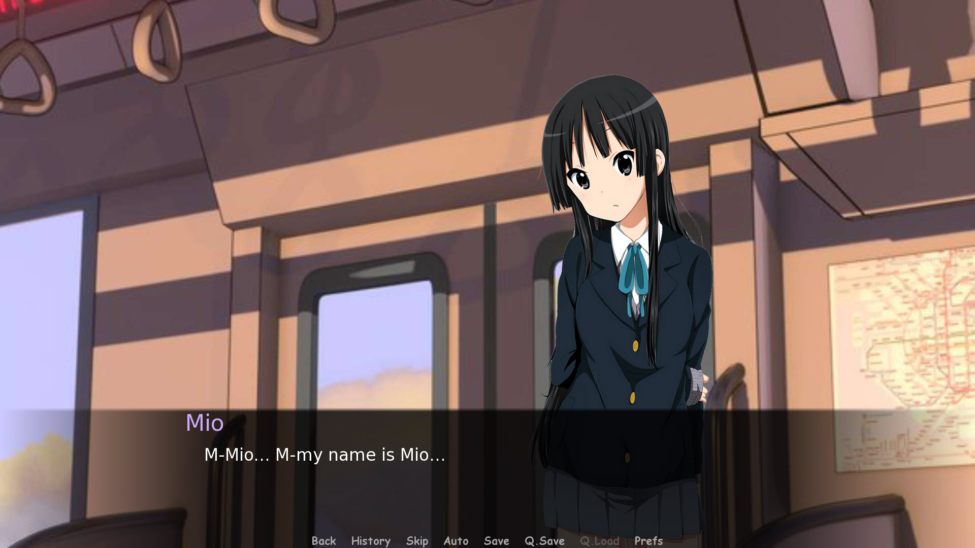 It's a short visual novel about us as a main character and Mio Akiyama which is actually a character of manga serie "K-ON!". The story which has started by accidental meeting in the train. How will two shy and introverted persons communicate with each other and will we get something more?