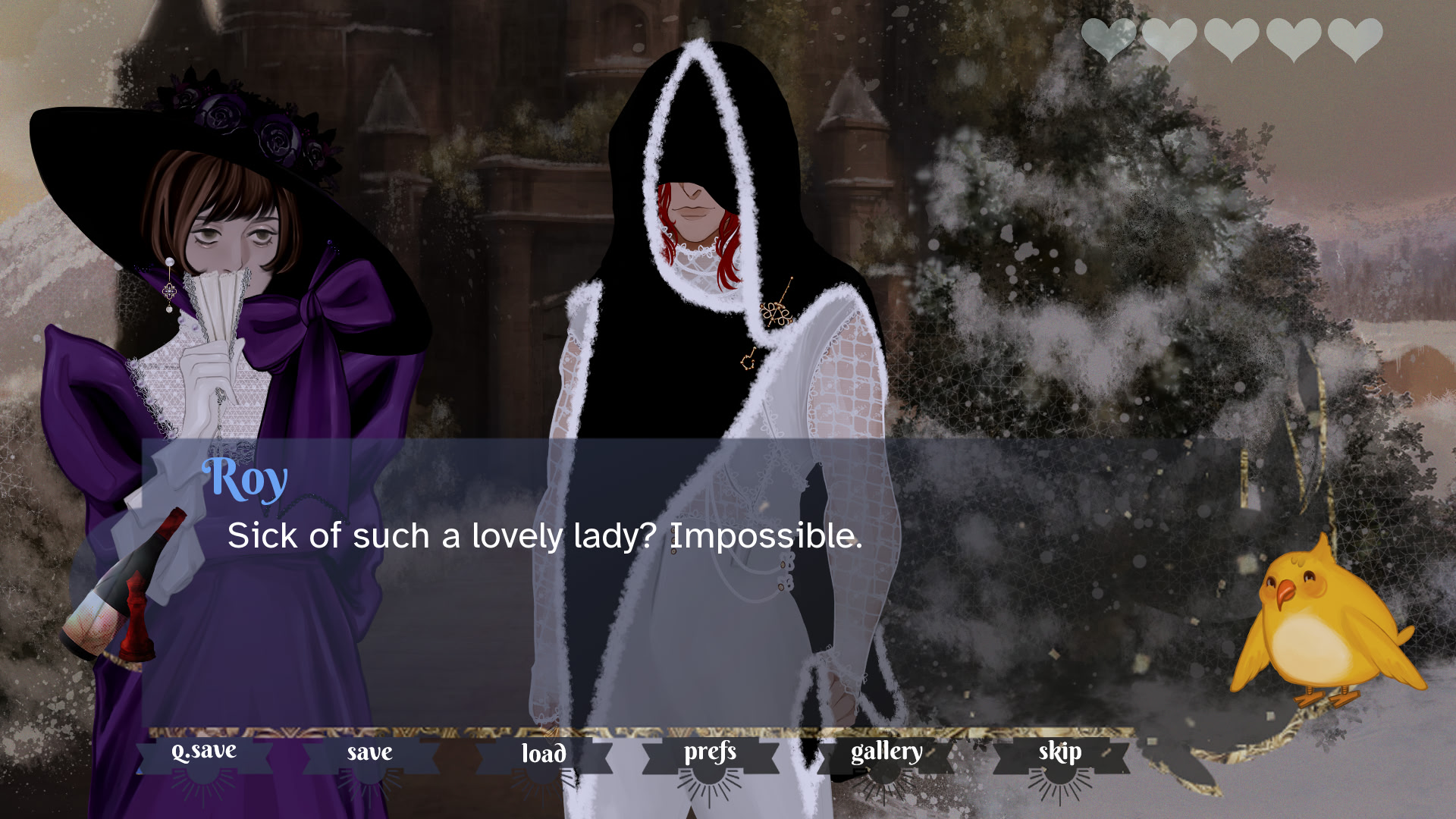 Expelled from the modern world into a novel, you occupy the body of a minor villainess, on her way to marry the beastly Duke of the North. (Why does that sound familiar...) Your mission? To have him fall for you. Should be easy, right? Or maybe this is all a dream? You decide. itch.io]