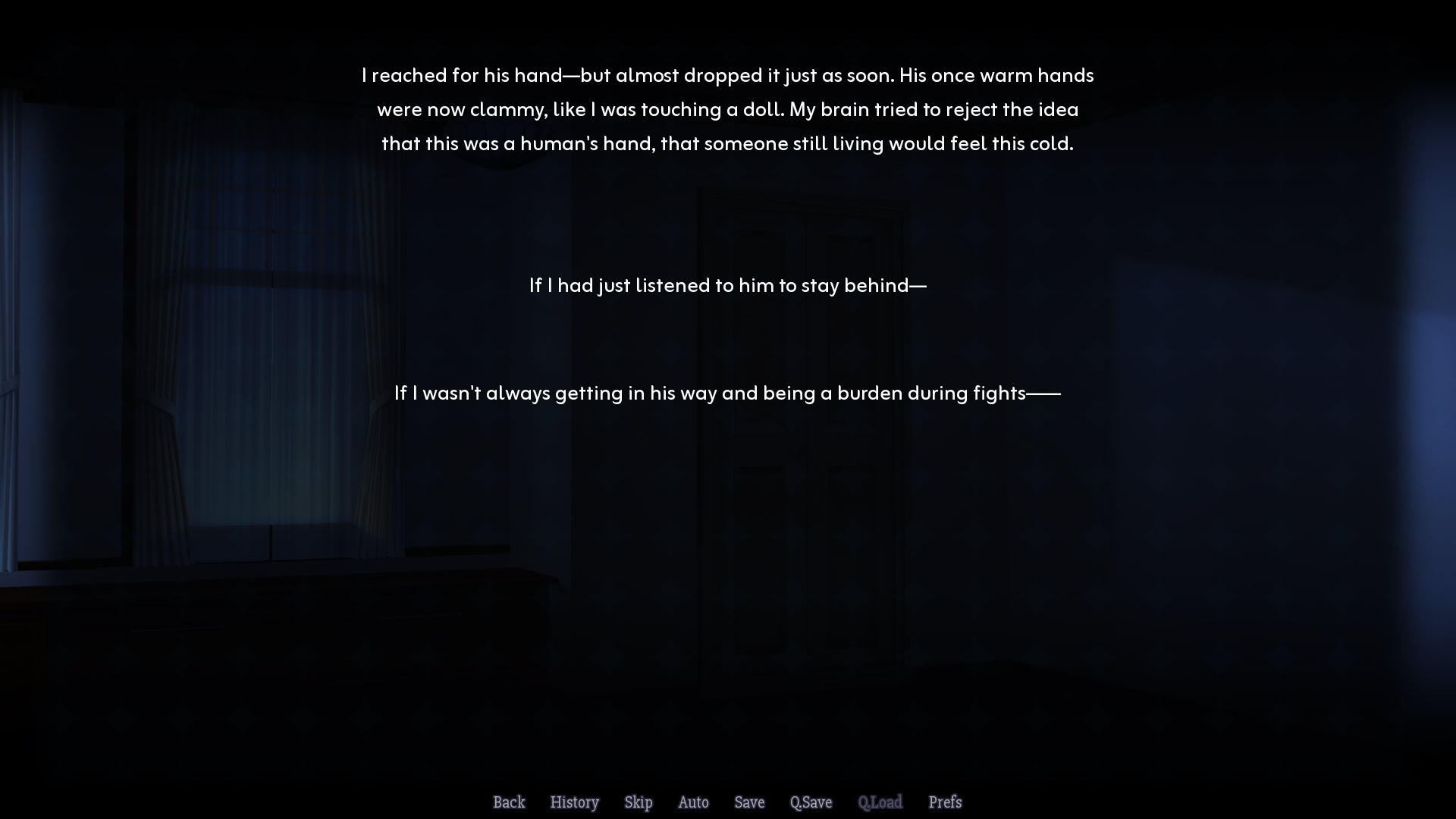 Your partner gets injured in a fight but you manage to find his brother's home. You'll be safe here until he recovers. Until then, just relax and reminisce. itch.io]