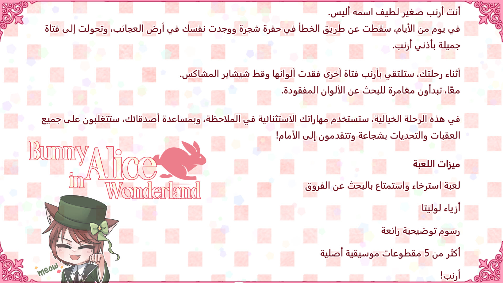 You are a cute little rabbit named Alice. One day, you accidentally fell into a tree hole and found yourself in Wonderland, transforming into an adorable bunny-eared girl. During your journey, you will meet another bunny girl who has lost her colors and a mischievous Cheshire Cat. Together, you emb...
