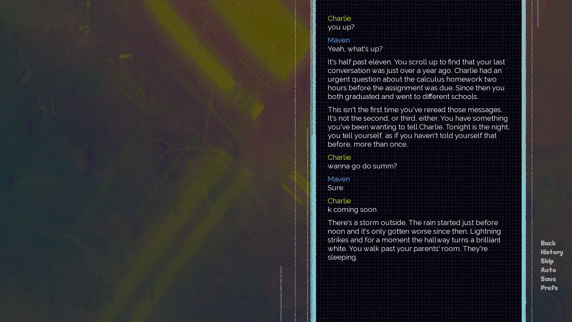 Charlie sent you a message asking if you were awake. It's half past eleven. Yeah, what's up, you reply. Your last conversation was just over a year ago.