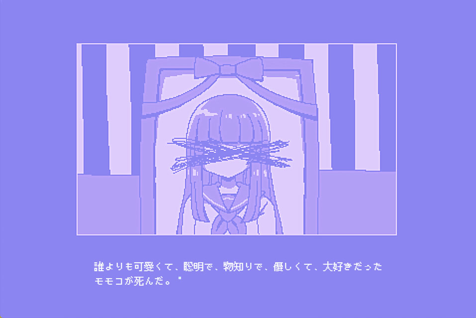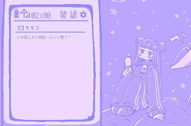 "Where do you think people go when they die?" A "Heisei Menhera Literature" visual novel in which you chat with your friend, Momoko, via email at 2am. A little bit of sci-fi, a little bit depressing. There are no complicated branches. You can see all the endings by looking at the choices in order...