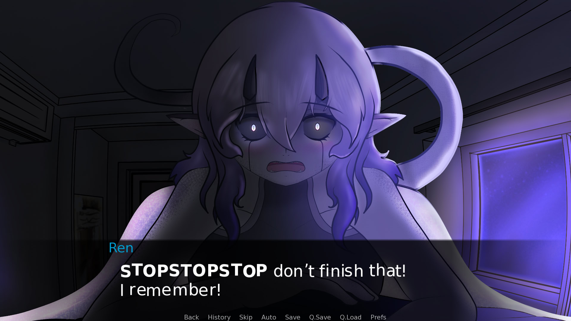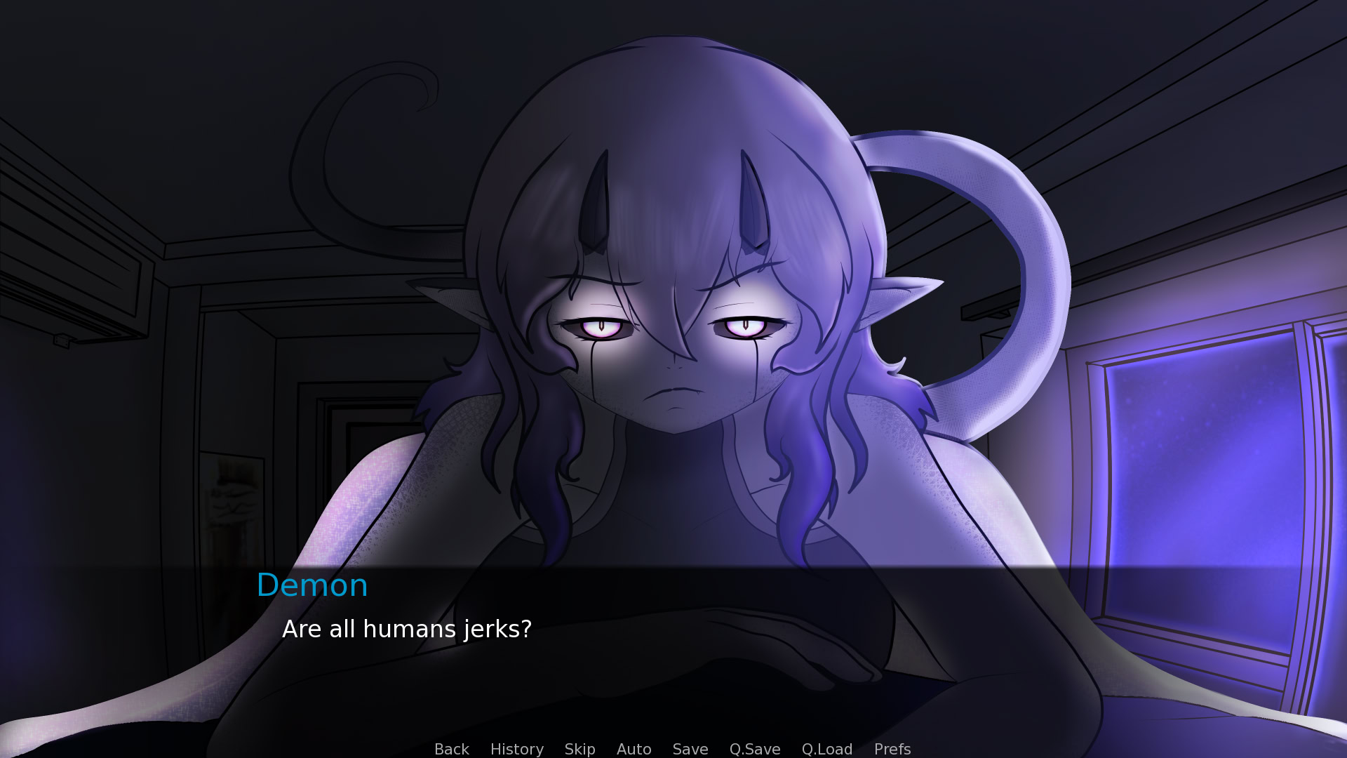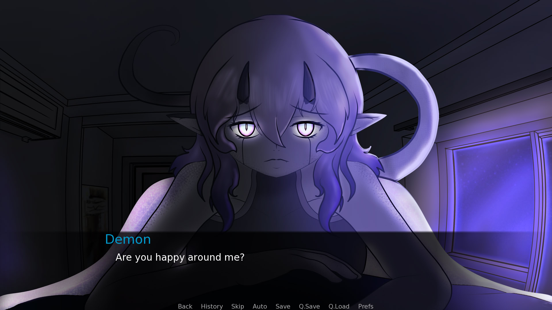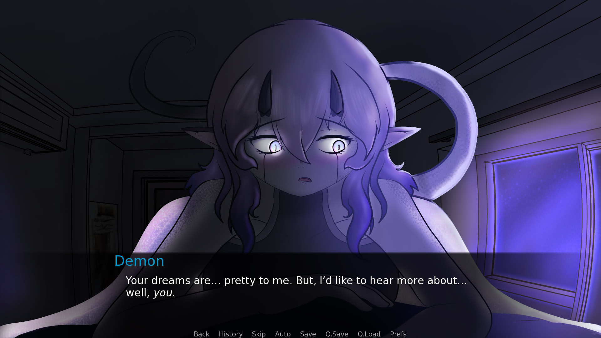 For reasons unknown, a sleep paralysis demon made herself known to you. As she eats your dreams, you're spared from the reoccurrence of the nightmares. So, while she's a bit of a... weirdo, you can tolerate her presence if it spares you from the abyss of nightmares that await you when you sleep.