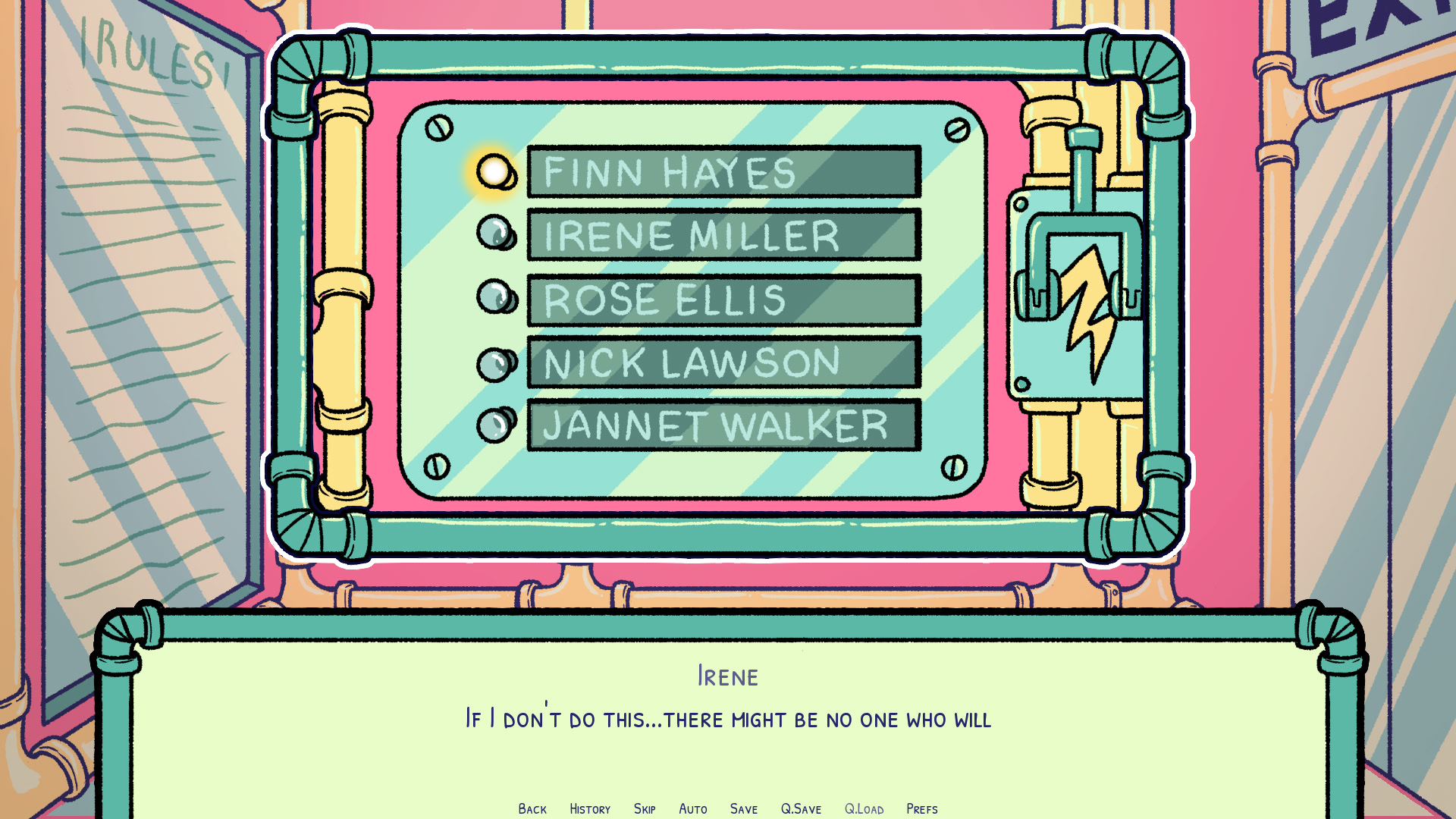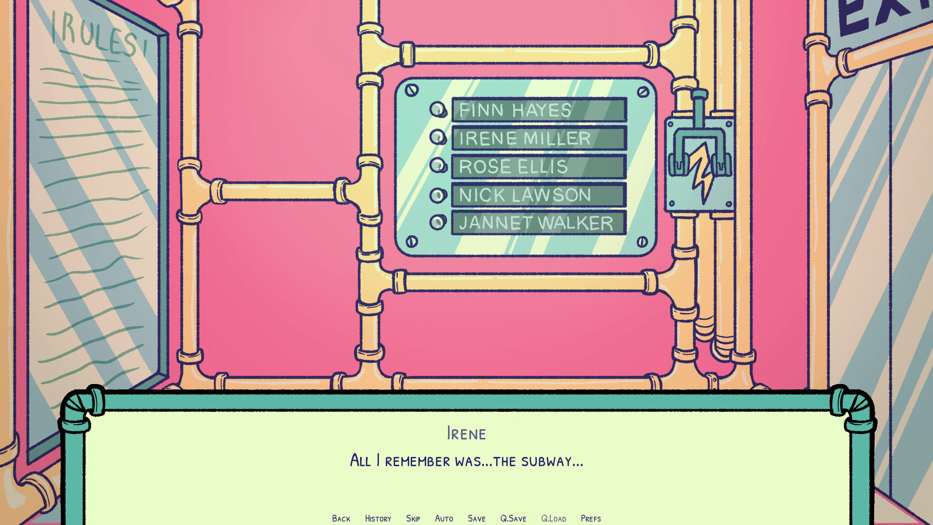 Irene wakes up in a strange place only remembering passing out on the subway. She has just been kidnapped and has no idea of what to do. All she can see is a board with some names, a lever and a board with rules: