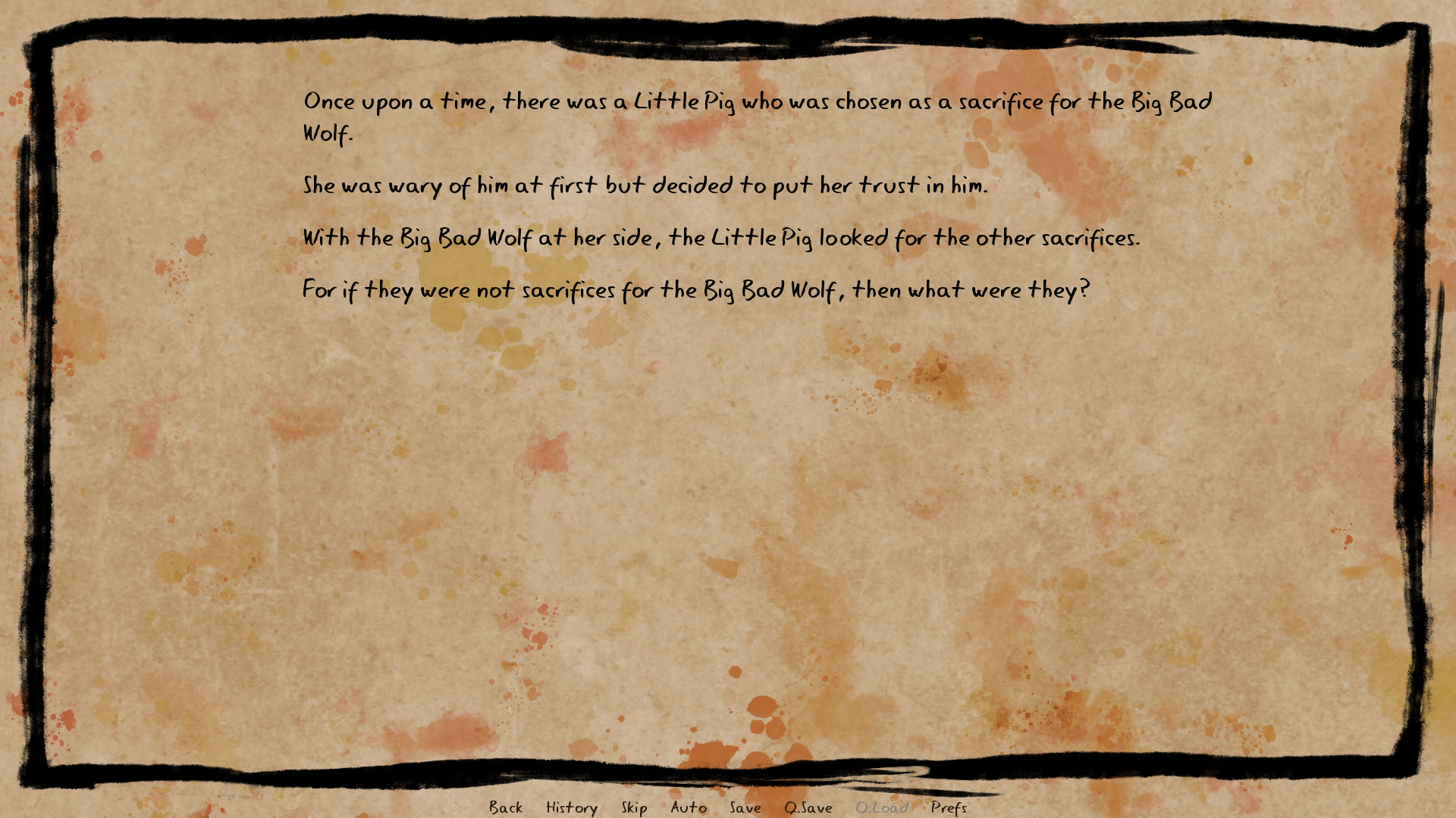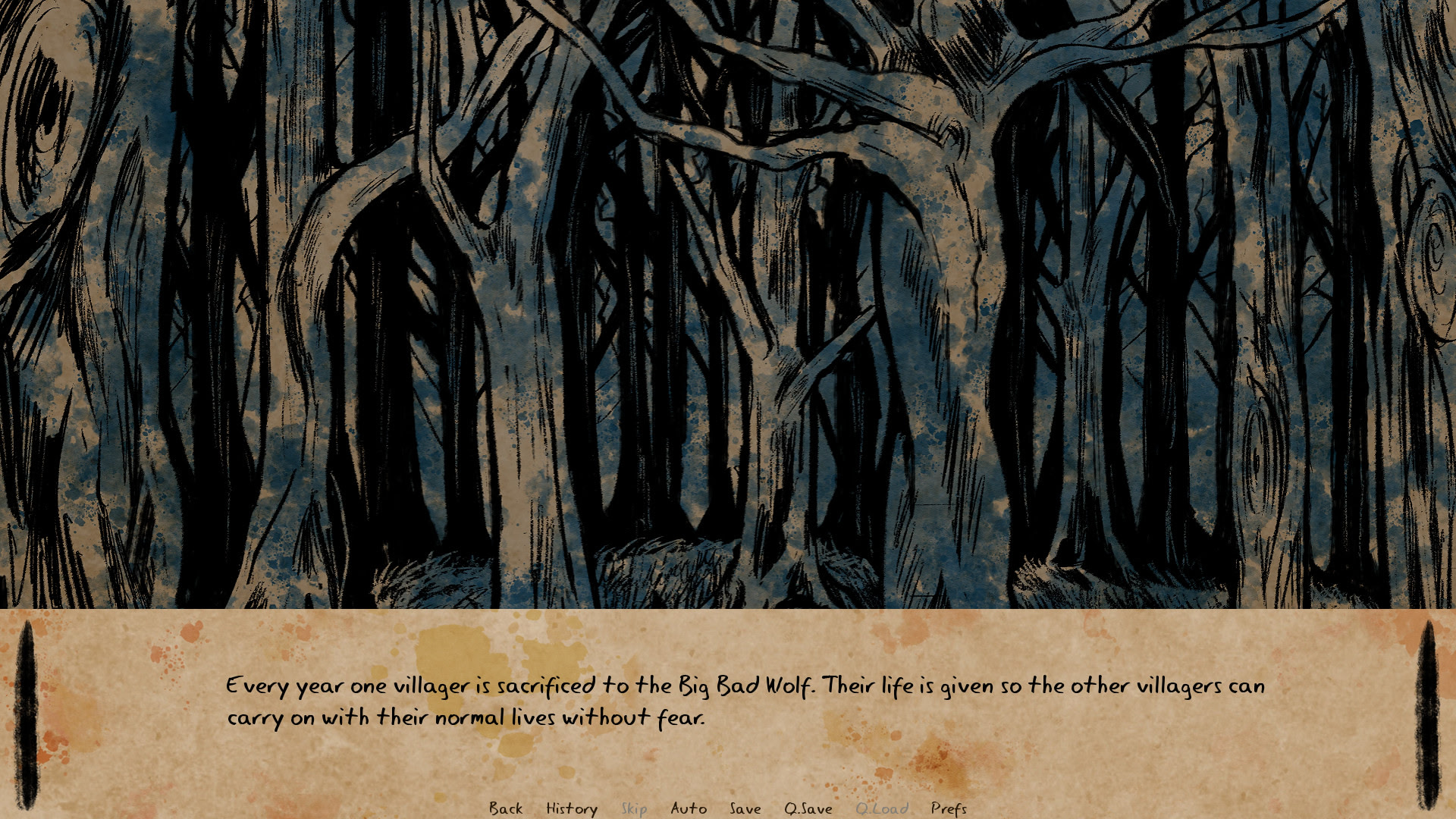 Every year one villager is sacrificed to the Big Bad Wolf. Their life is given so the other villagers can carry on with their normal lives without fear. This year the sacrifice is me. itch.io]