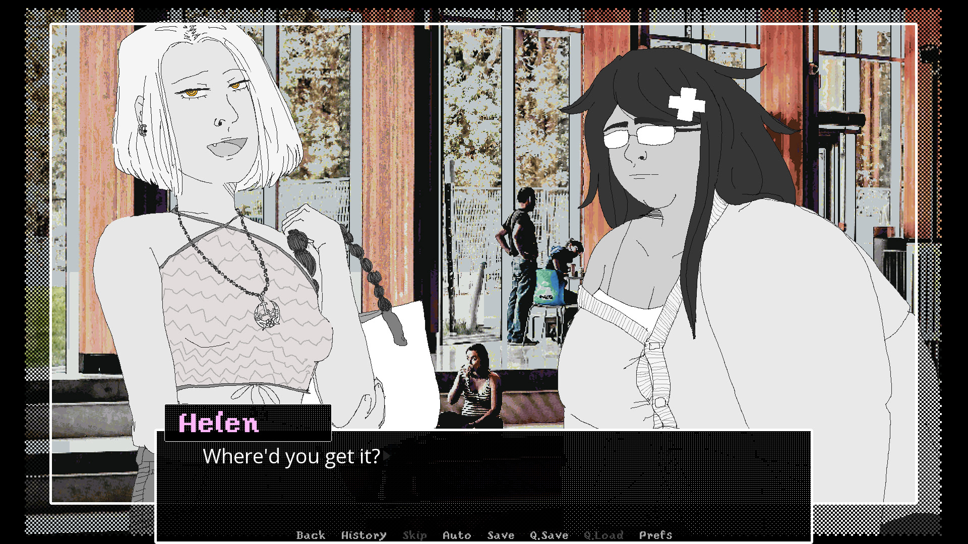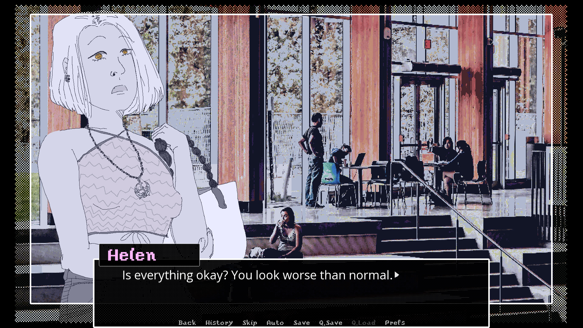 Alex is a loner college student that works hard to live up to society's standards. One day she meets a mysterious woman, Helen, who gifts her more food and things than she knows how to handle! What does this woman want from Alex? itch.io]