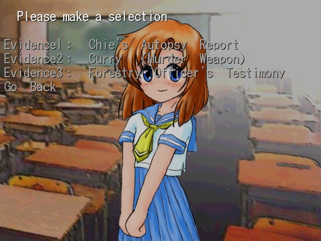 A curry related crime has been committed, and Keiichi must fight to prove his innocence. This short game features the cast of Higurashi conducting a trial with gameplay straight out of Ace Attorney.