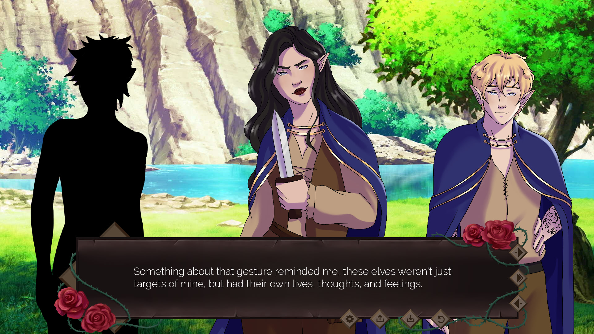 You are an integral part of the royal rangers, serving the king of Allton. Due to recent brewing issues with the neighboring elven kingdom, Kedarn, you have been busier than ever out in the field. For the first time ever, your company takes an elven prisoner. This mysterious fellow is different than other elves you've encountered. Decide whether this meeting will take you down the road of romance, friendship, and even betrayal with your fellow rangers.