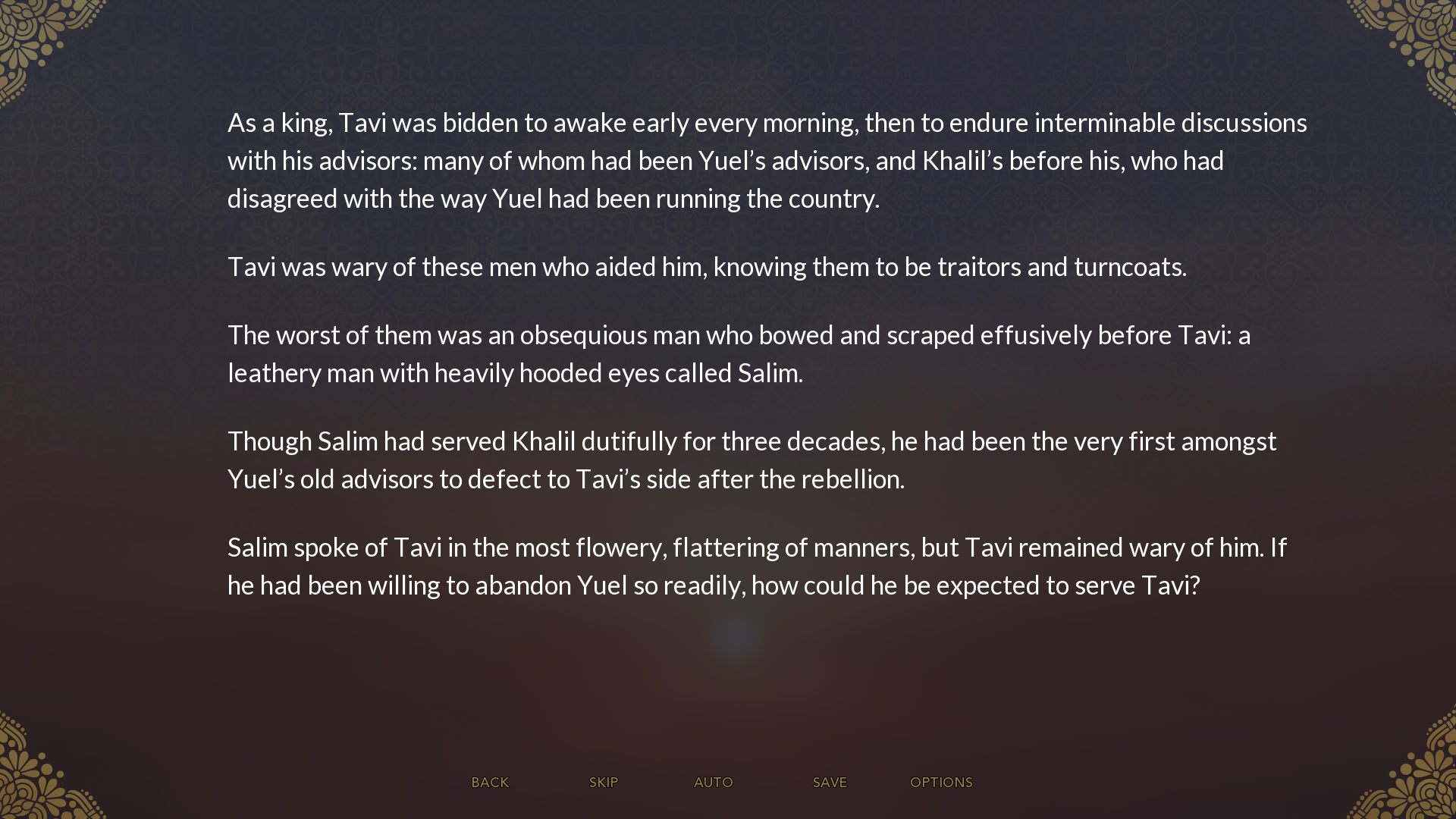 Ascending to the throne at a mere eighteen years of age following his father's death, Yuel is tasked with running the whole country without being amply prepared for such a massive undertaking. A series of poor decisions damages Yuel's popularity with his people and his own advisors, until Yuel's own cousin, Tavi, leads a rebellion to depose him.