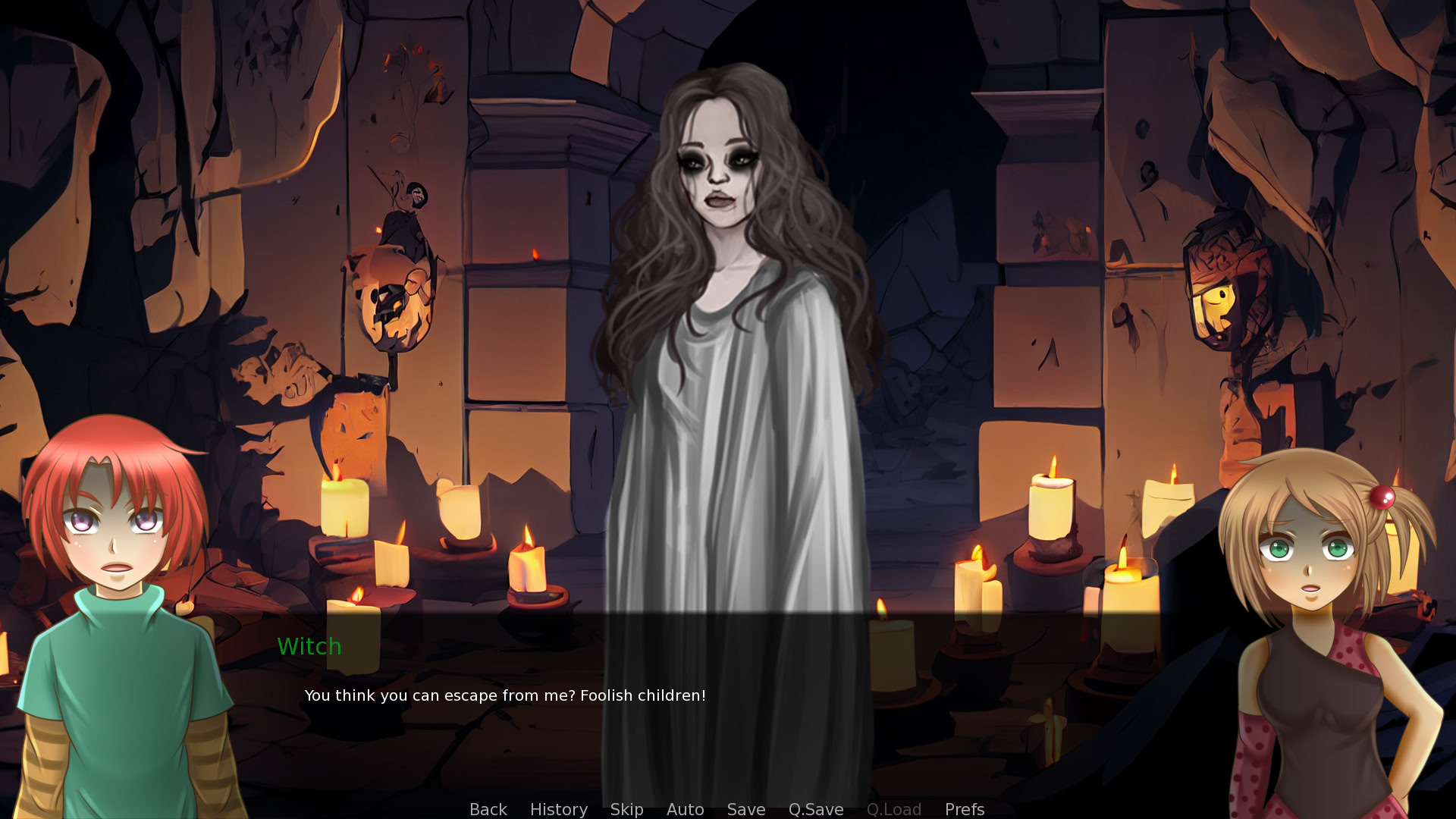 Join our protagonists in this horror visual novel as they venture through deep caverns, navigate their way through traps, and take their last stand against an evil witch who eats children!! Every choice impacts the ending of the game, and with multiple endings, you're sure to have a scary good time every time!