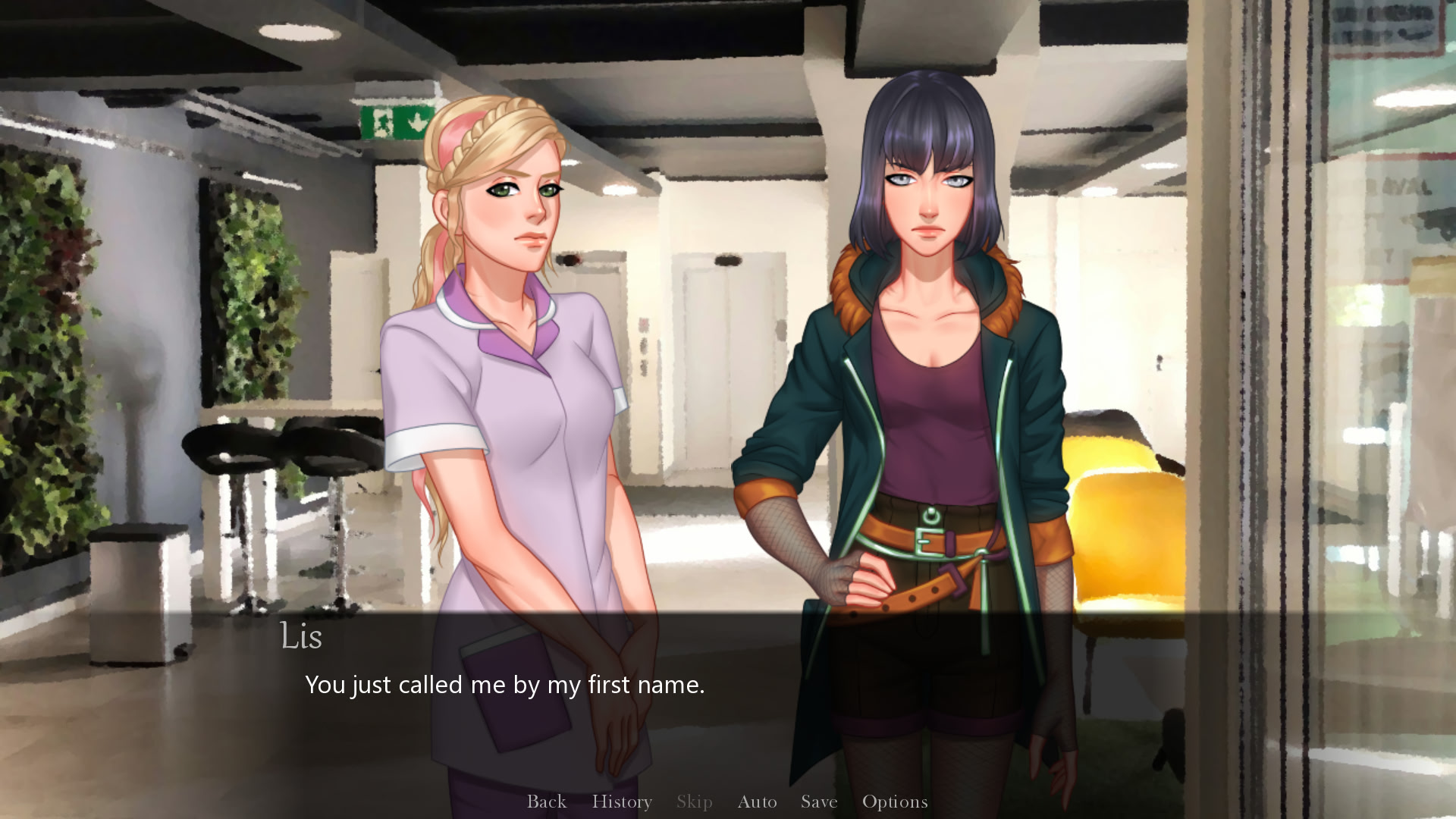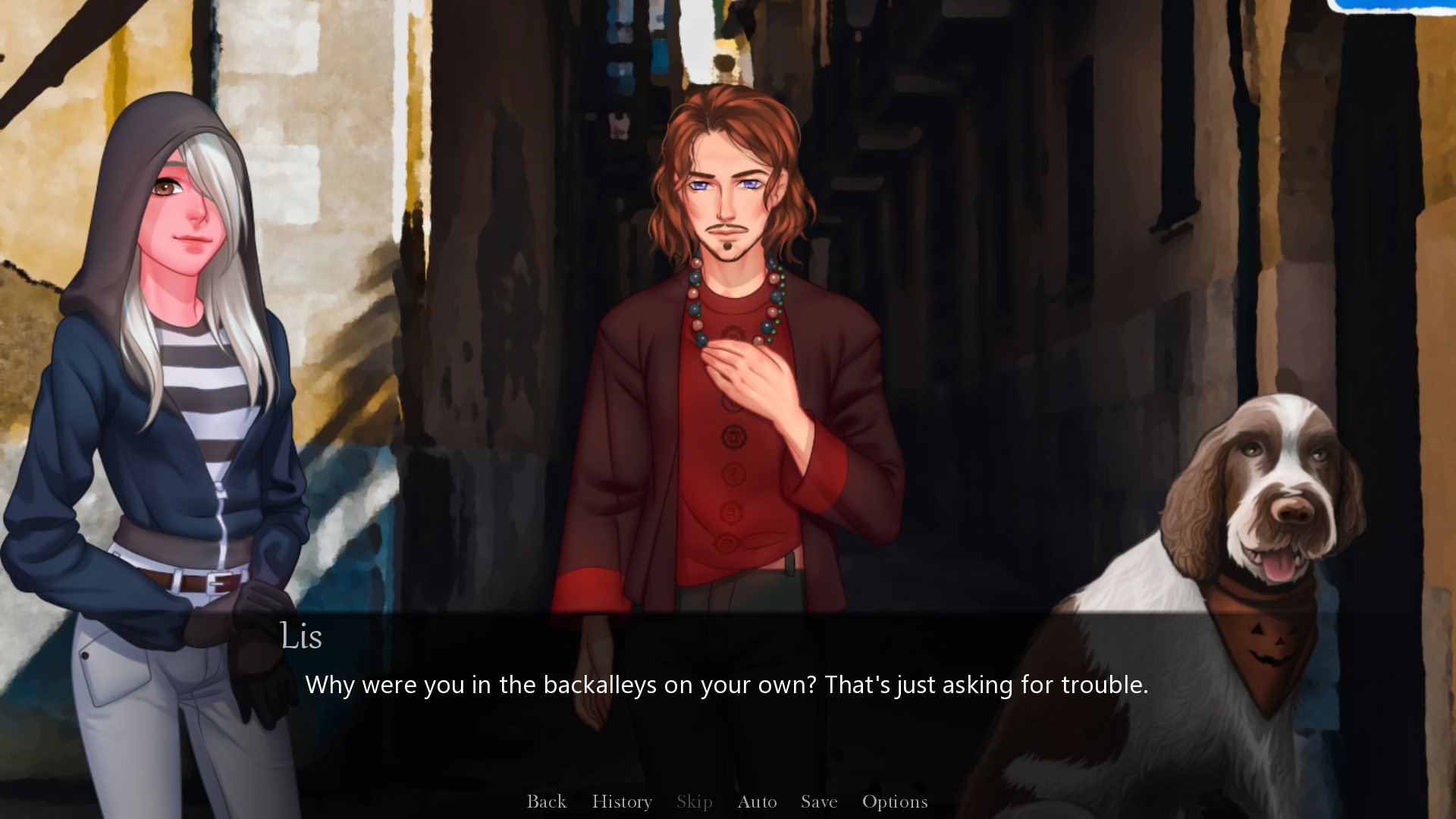 "Amnion River" is a visual novel following Lis, a young thief from Whitecalder trying to rekindle her long-lost passion for painting, as she deals with her declining health and recurring nightmares. One day, a nameless young girl with unusual, reddish skin, snow-white hair and no clear memory of her past enters her life seemingly out of nowhere. Lis decides to take her in and names her Clair, a name she vaguely feels befits her perfectly.