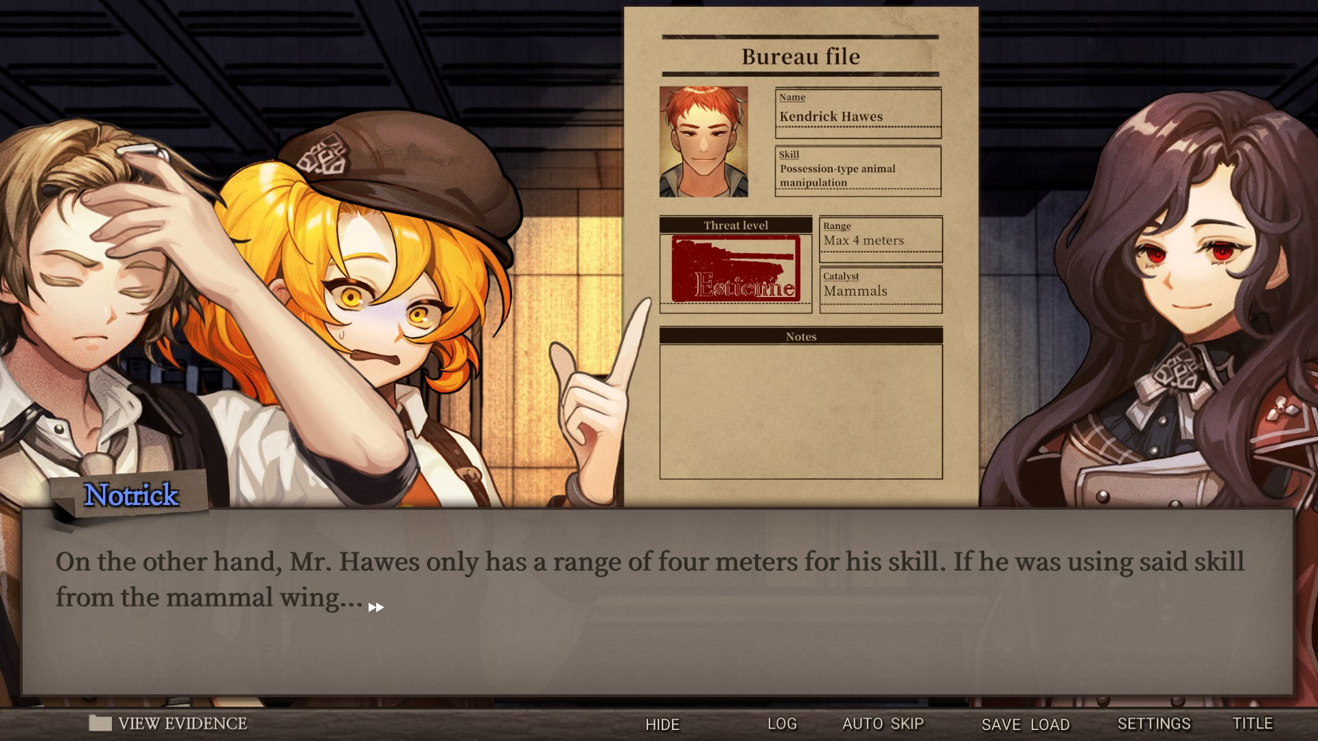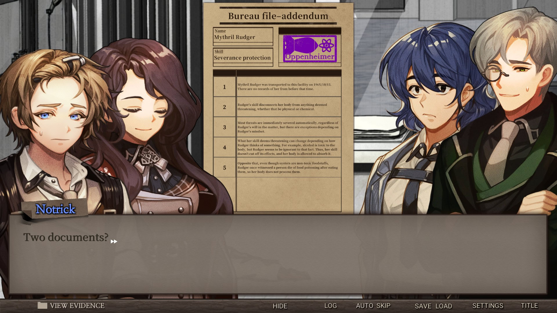 Fortunately, it's not only the criminals who have these supernatural abilities. All of Notrick's fellow detectives at the Mana Affairs Division are also staffers (Excepting gumshoe Notrick himself, of course!) The senior detectives use their supernatural abilities to investigate the crime scenes and organize their findings into documents. Testimonies that account for emotional distress, invisible trace that tells when evidence was left, even memories that remain in objects—find contradictions using the various clues at your disposal!
