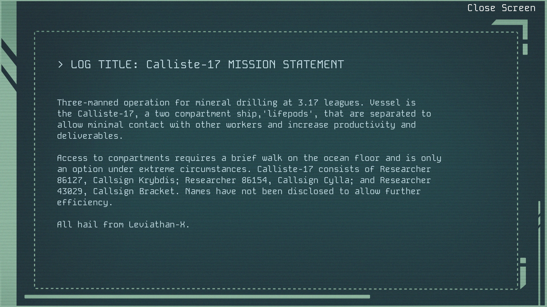 In the dark depths of the ocean sits Calliste-17, a submersible managed by a small team to further the research and agenda of corporate greed. What should have been a routine mission erupts in chaos when you, Krybdis, waken to a ravaged ship and a familiar voice over the radio.