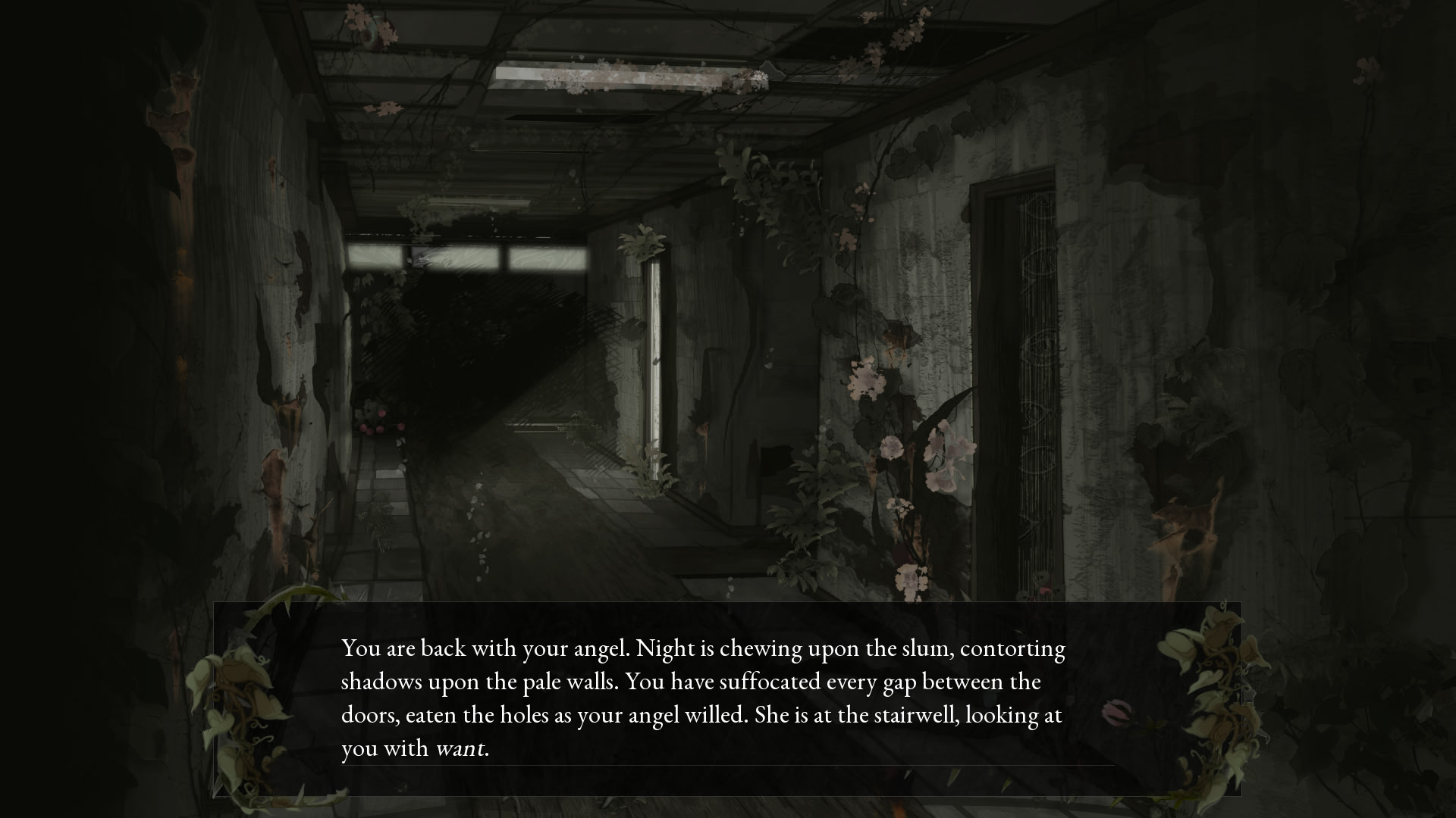 You're Eden, the eldritch Biblical garden. You're in love with your angel Ezekiel. But Ezekiel is enamored by the slum and the angels stagnating in it. She wants the slum angels to fall. You would to do anything to help her. But she wants you to swallow up the slum as she starts dalliances with i...