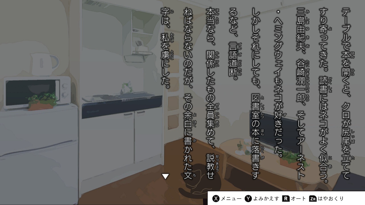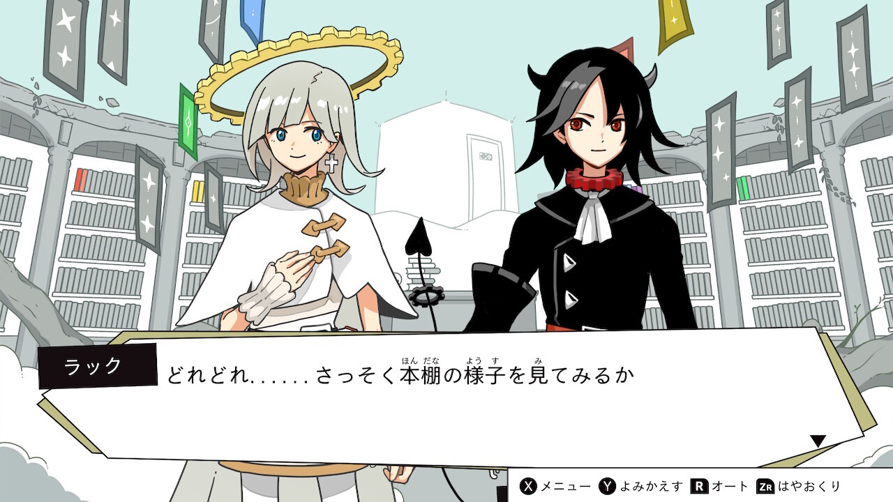 The game features 100 game-original stories with unique graphics and sounds, described as sometimes fun, other times scary, and occasionally moving. Each story can be completed in five minutes and ends with an unexpected twist. The stories available to read are determined by speaking to the game’s two librarians—the angelic Whi and devilish Lack—allowing you to forge your own story depending on what kind of conversations you have.