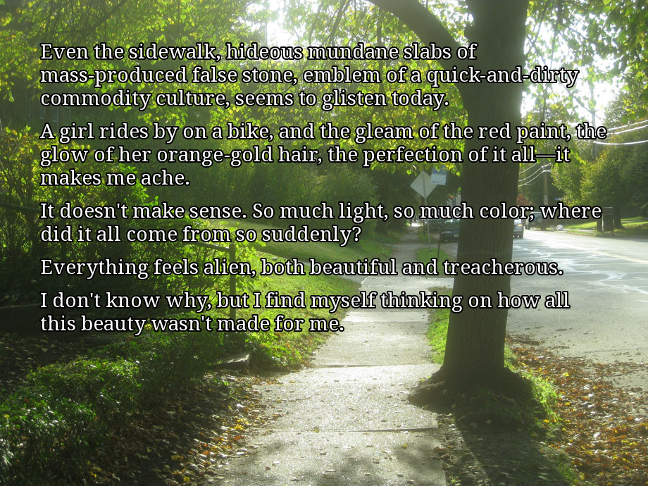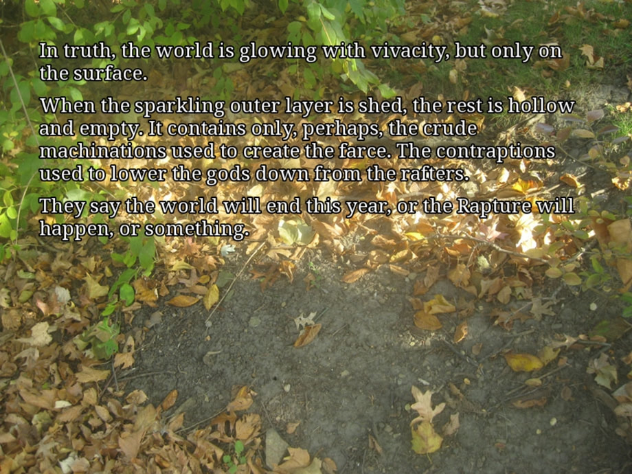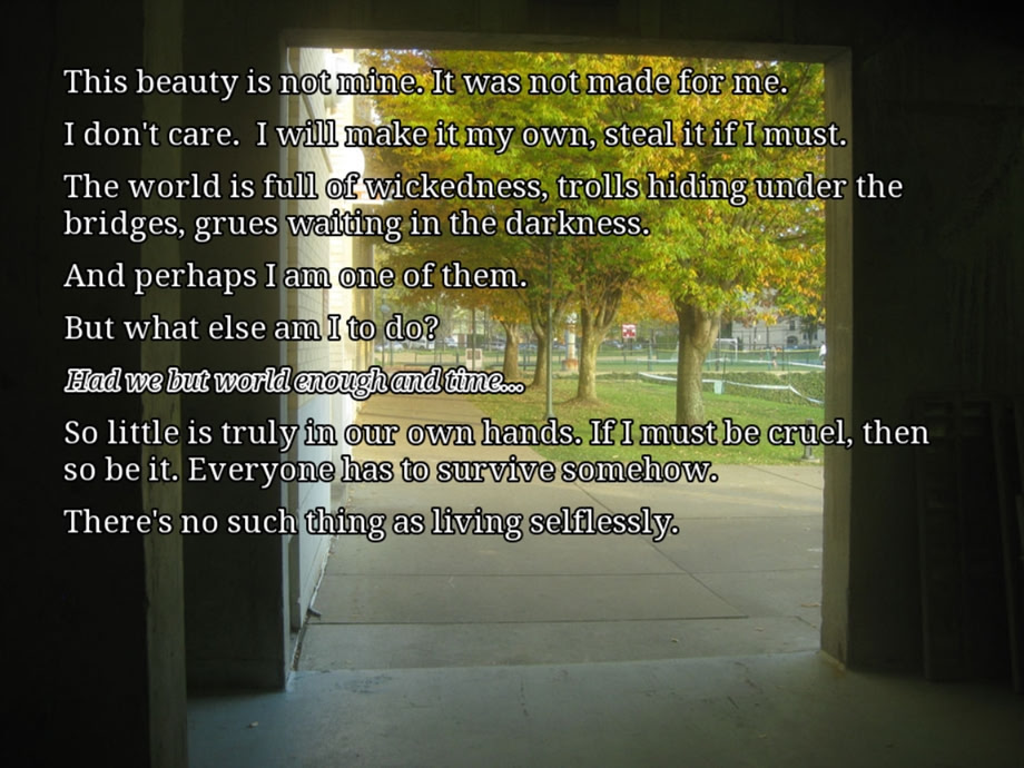 A brief meditation on light and beauty and living life. A somewhat experimental kinetic novel made up of photographs and first-person narration, without any characters per se. Lemma Soft Forums]