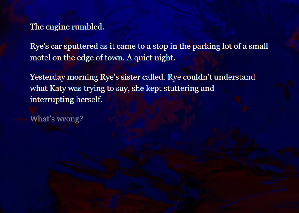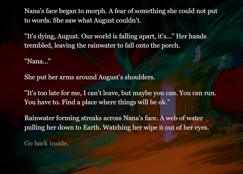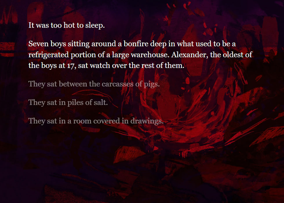An old woman seeks salvation for her granddaughter as the world ends around her. A cult of children worshiping the carcasses of dead pigs prepare to carry out their final task. Someone comes back home after a decade of promising themselves that they never would. itch.io]