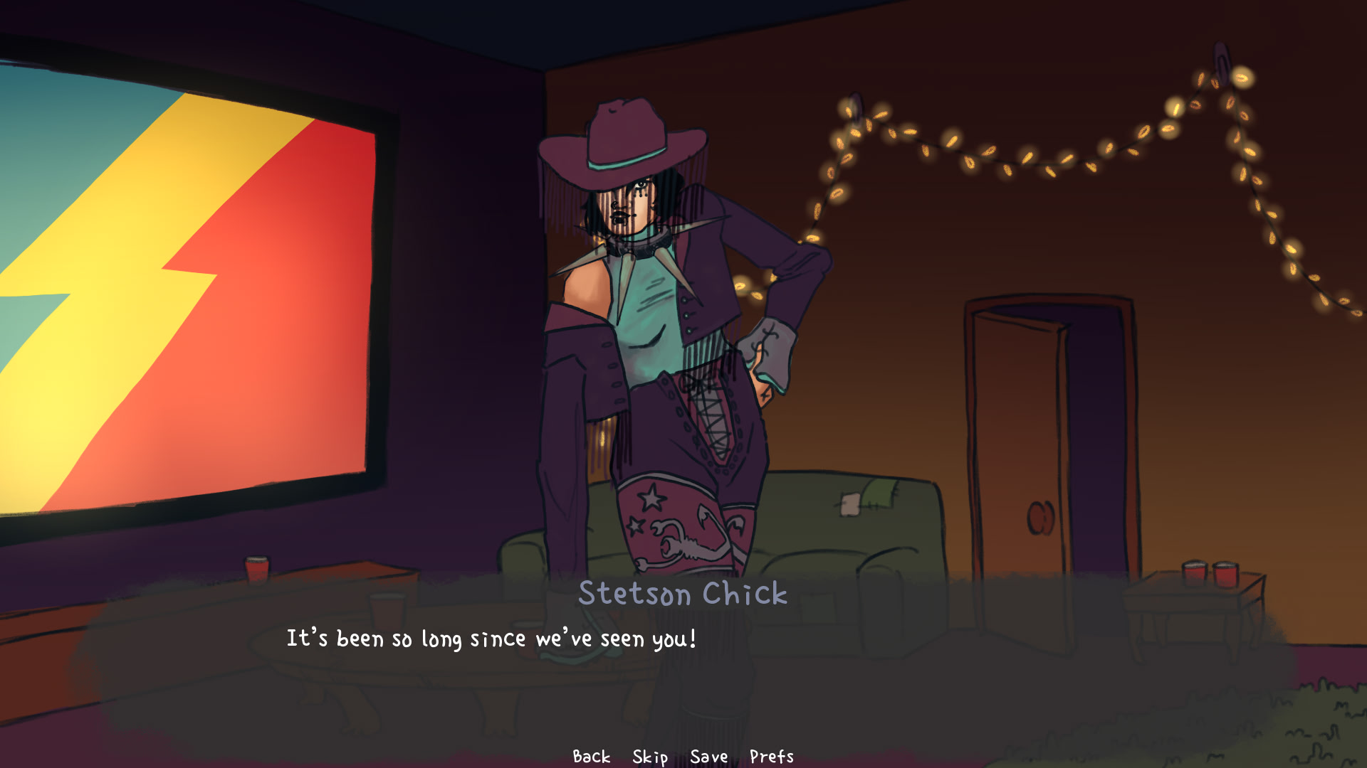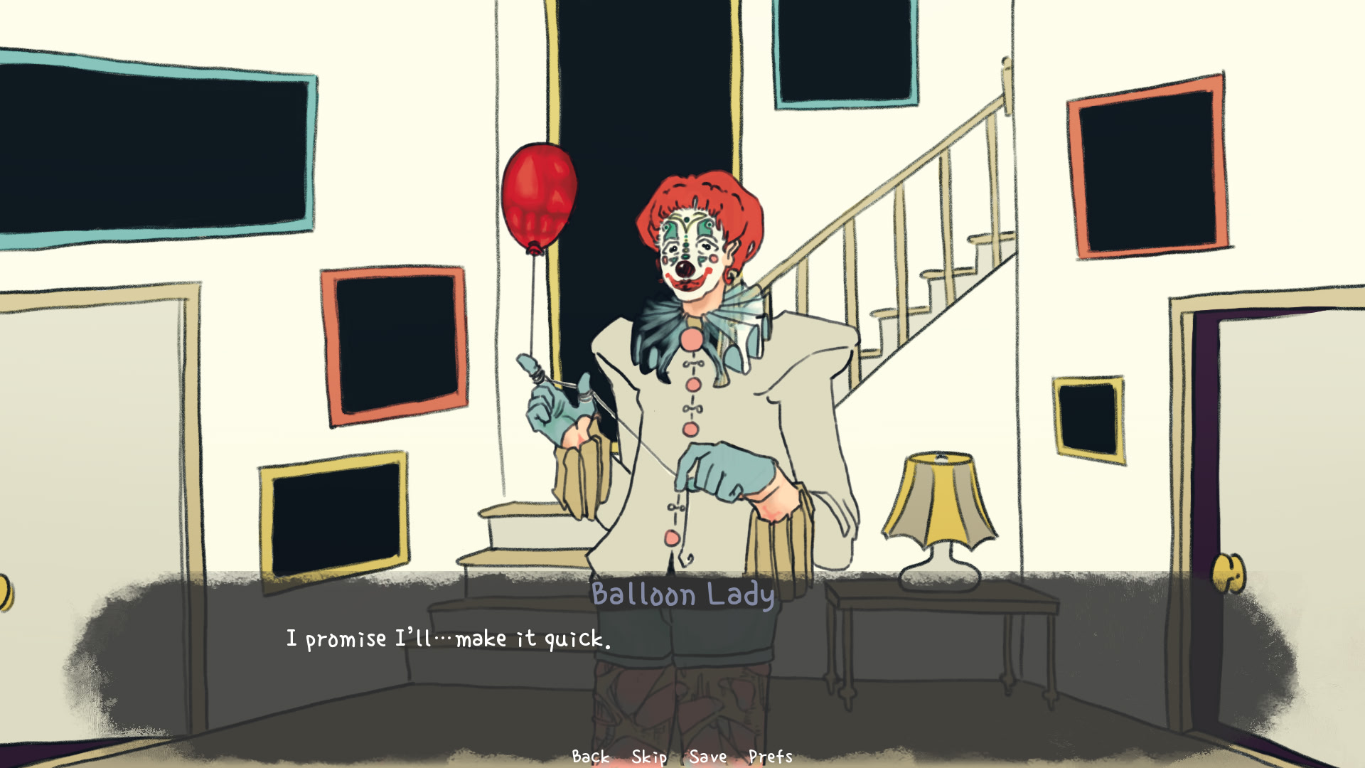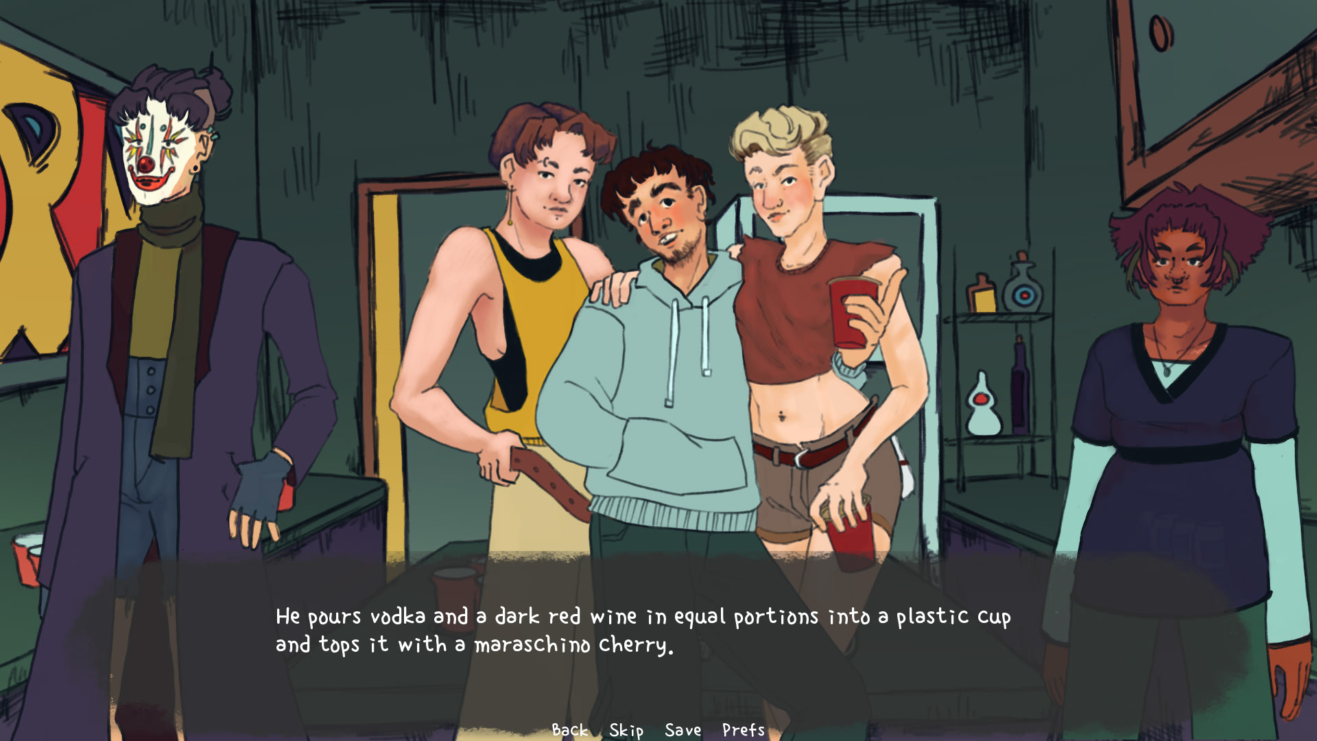 After years of blowing off everyone you know, you attend a house party and run into your old friend. If only your words would come out right. It's a house party with a bit too many clowns and people you don't remember. itch.io]