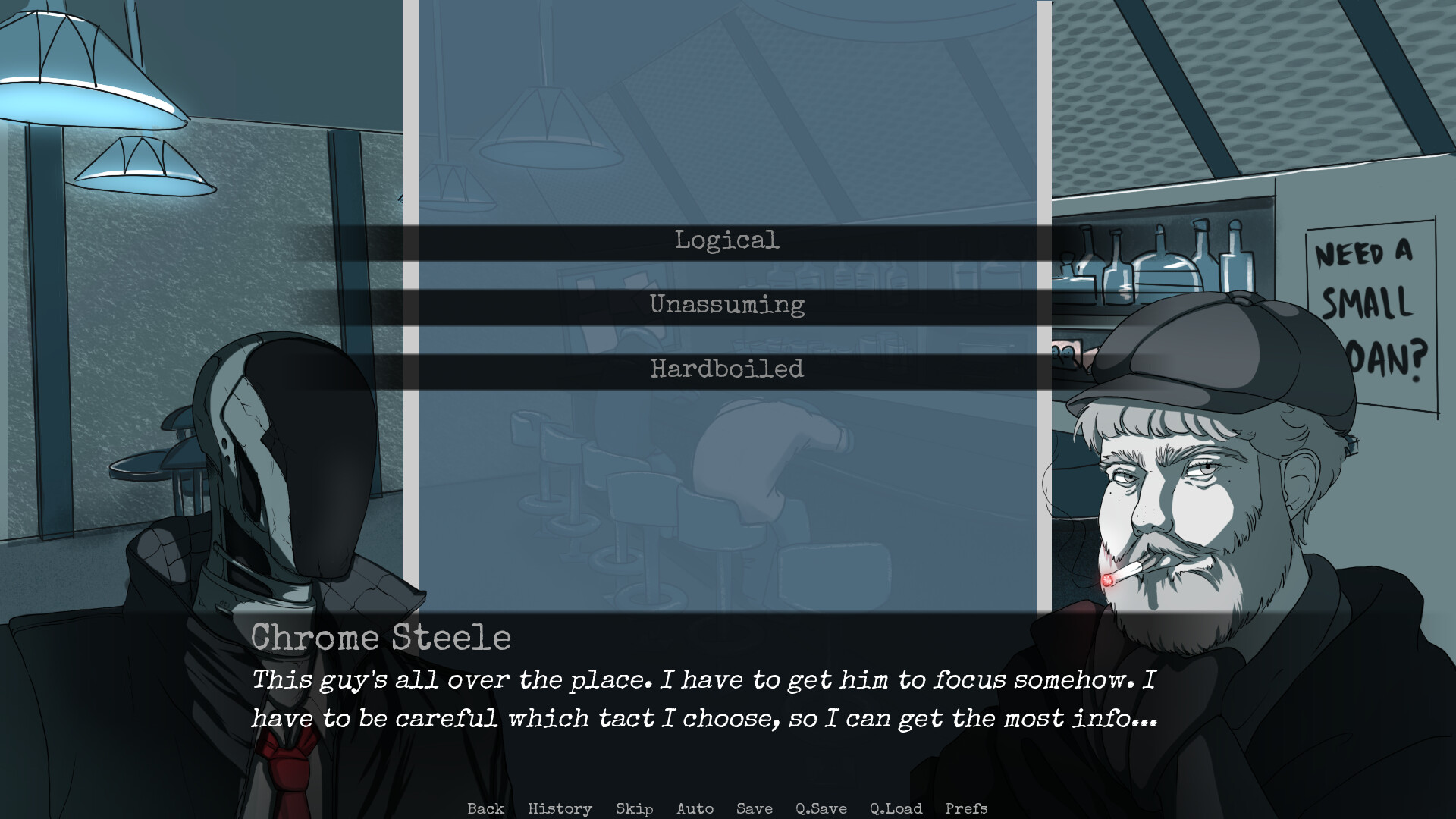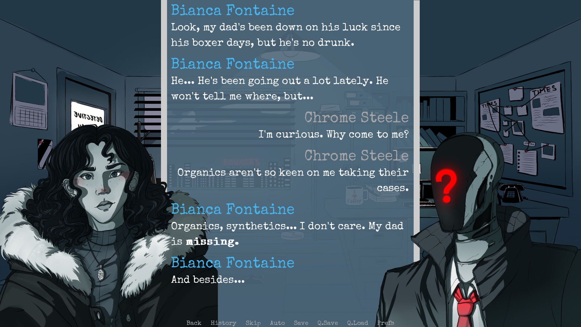 A desperate girl with α missing father turns to Chrome Steele P.I., an android detective heavily influenced by the fictional greats.