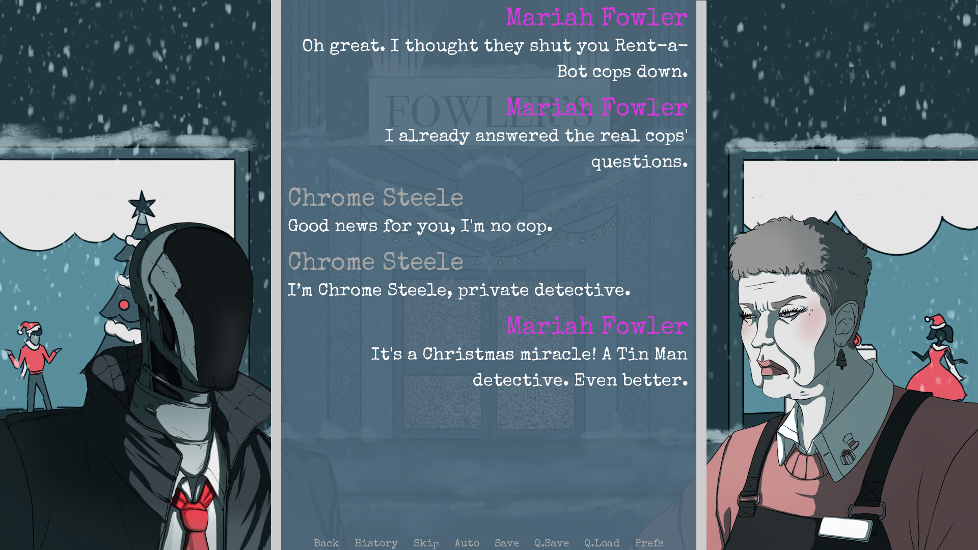 A desperate girl with α missing father turns to Chrome Steele P.I., an android detective heavily influenced by the fictional greats. Chrome is led down an icy path of checkered pasts, shabby street Santas, and one decidedly dead elf in the pursuit of justice and redemption. Can he find his own voi...