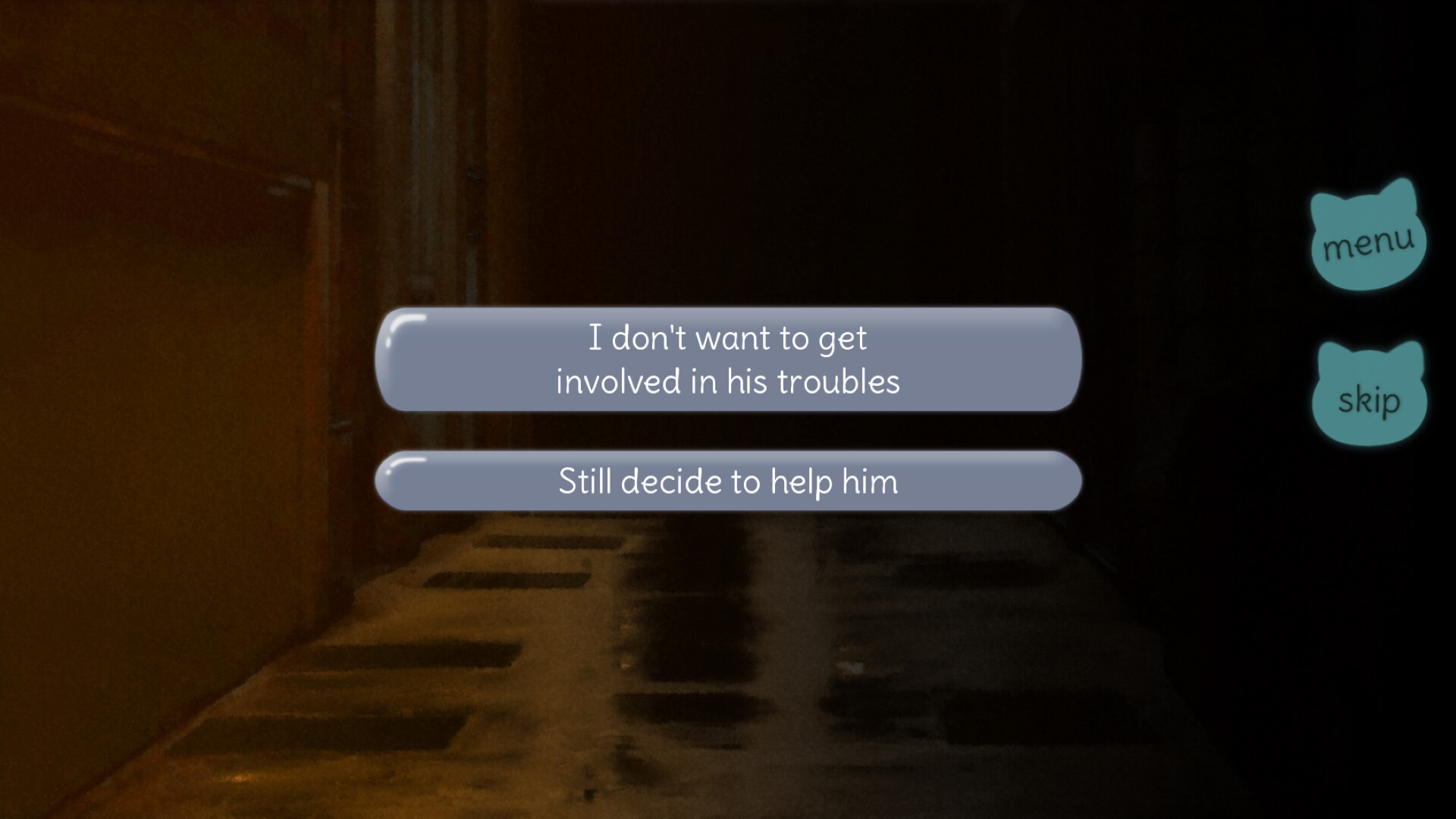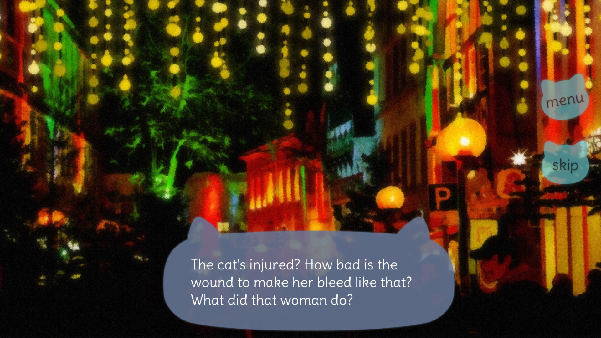 After Christmas gatherings, on your way home, you hear a loud noise on the street with a cat's scream. Will you come and see what happens? Will you help her or let her be? But it seems like... something else is waiting for you there. (source: https://plushp.itch.io/warmth-christmas)