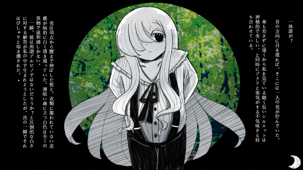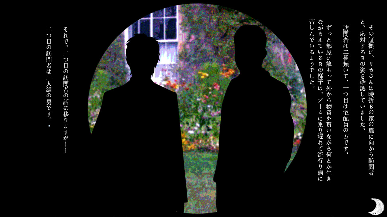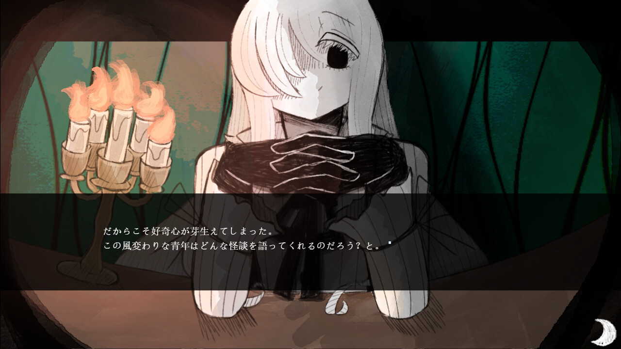 The main character, who had been completely drenched by a sudden downpour, sought shelter from the rain in a abandoned Western-style mansion. Coincidentally, a mysterious young man appeared and they decided to pass the time by sharing scary stories.